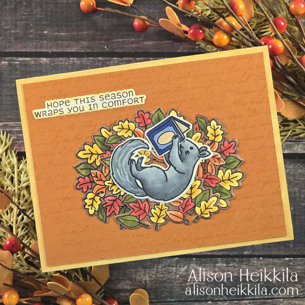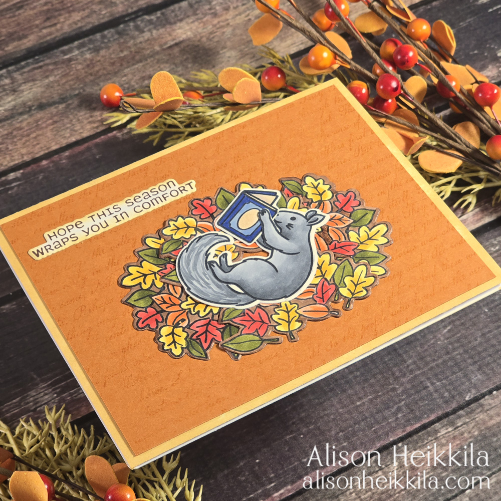 I love to read, so I was excited to be able to have a squirrel reading in a big pile of leaves. I colored all of my elements with Copic Markers. I used N2, N4, and N6 for the squirrel, but use whatever colors you have. I wound up coloring 5 piles of leaves. I used the coordinating dies to cut everything out, and I cut a slit between the squirrel’s arms so that I could slip the book in. I also colored around the leaves so that there wouldn’t be any white cardstock showing.