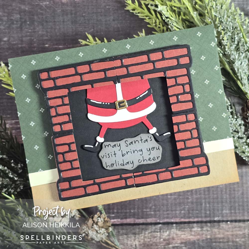Hello! The new Chimney Caper Stamp and Die Cutting Set from Spellbinders is intended to have a chimney on a roof with Santa’s bottom half stuck in the chimney. I have to be honest….this isn’t my favorite way to see Santa. So I decided to use some of the parts differently and instead of a chimney, I created a full fireplace, with Santa lithely dropping down, instead of being stuck, to deliver some toys.