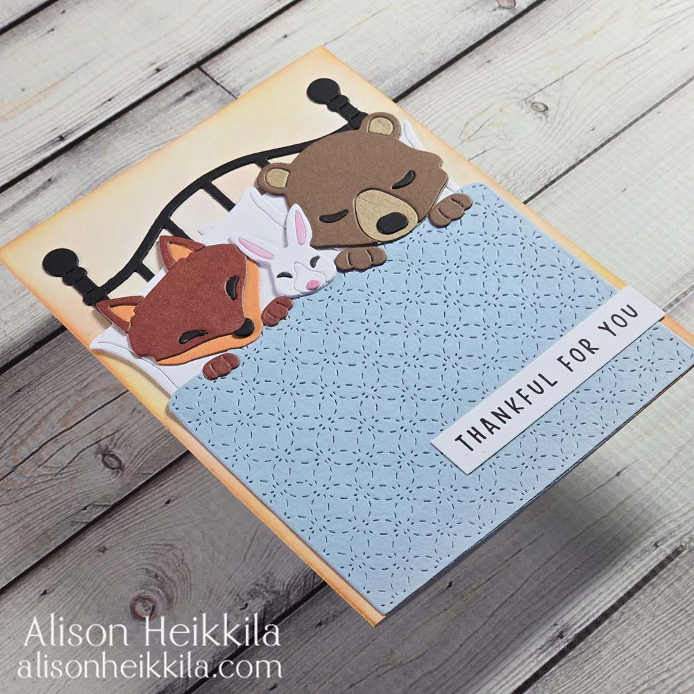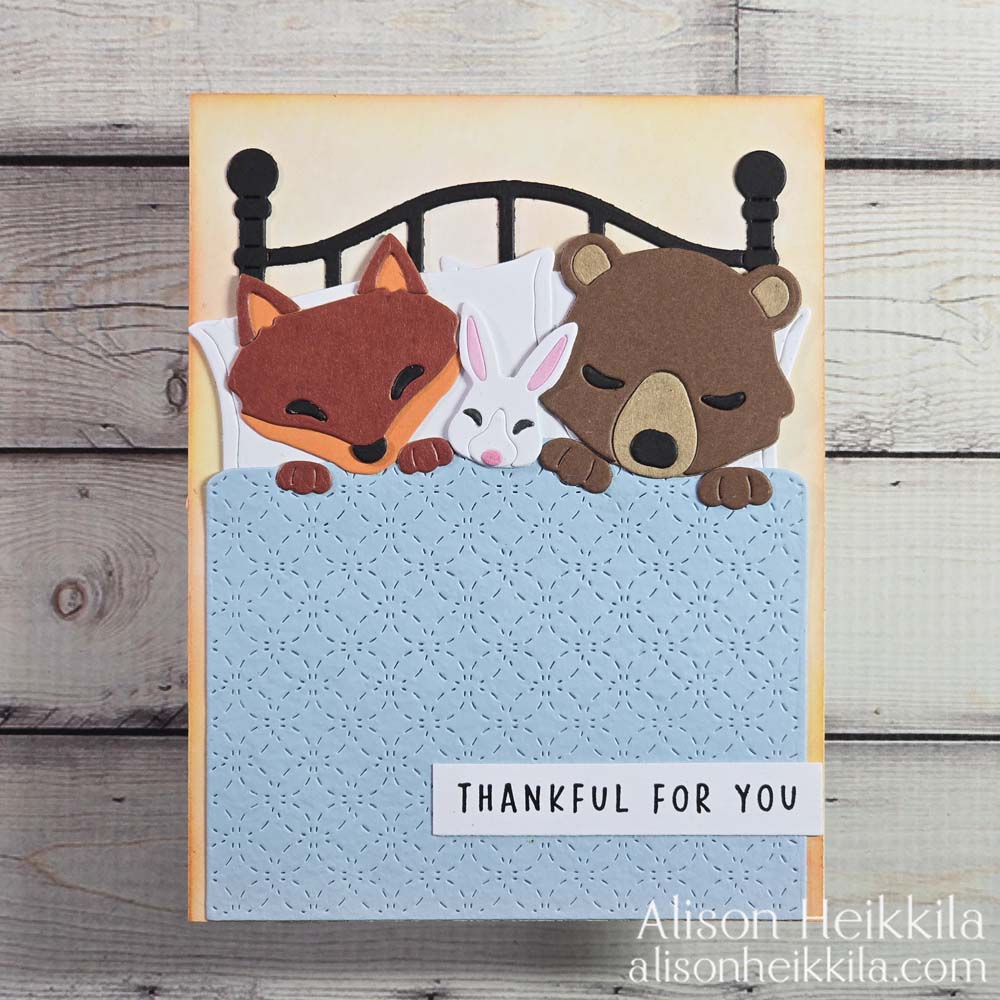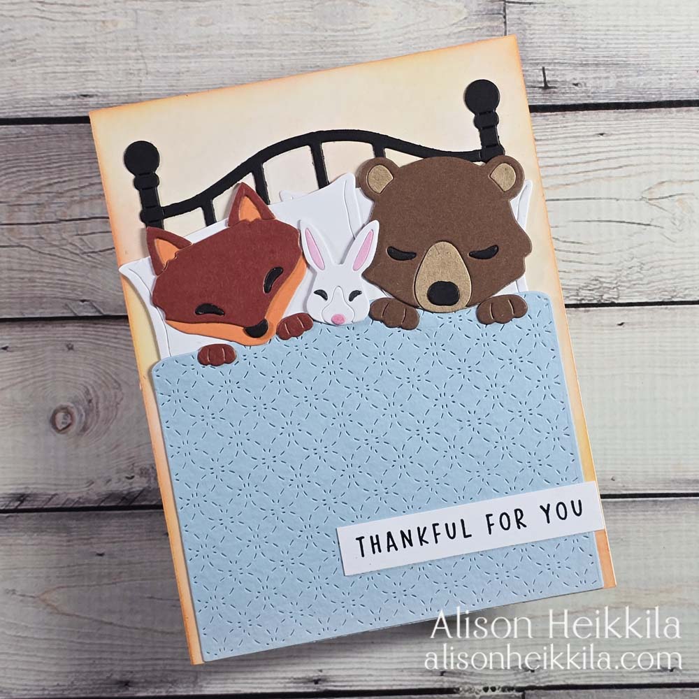 Hello! Sometimes, all I want to do is stay snuggled in bed, and my card today has a few critters that agree. I am using the September Die Set of the Month from Hero Arts, called Cozy Critters, and it’s just so cute! You have several options of critters that you can tuck into a big, comfy bed. Let’s check out what I made.