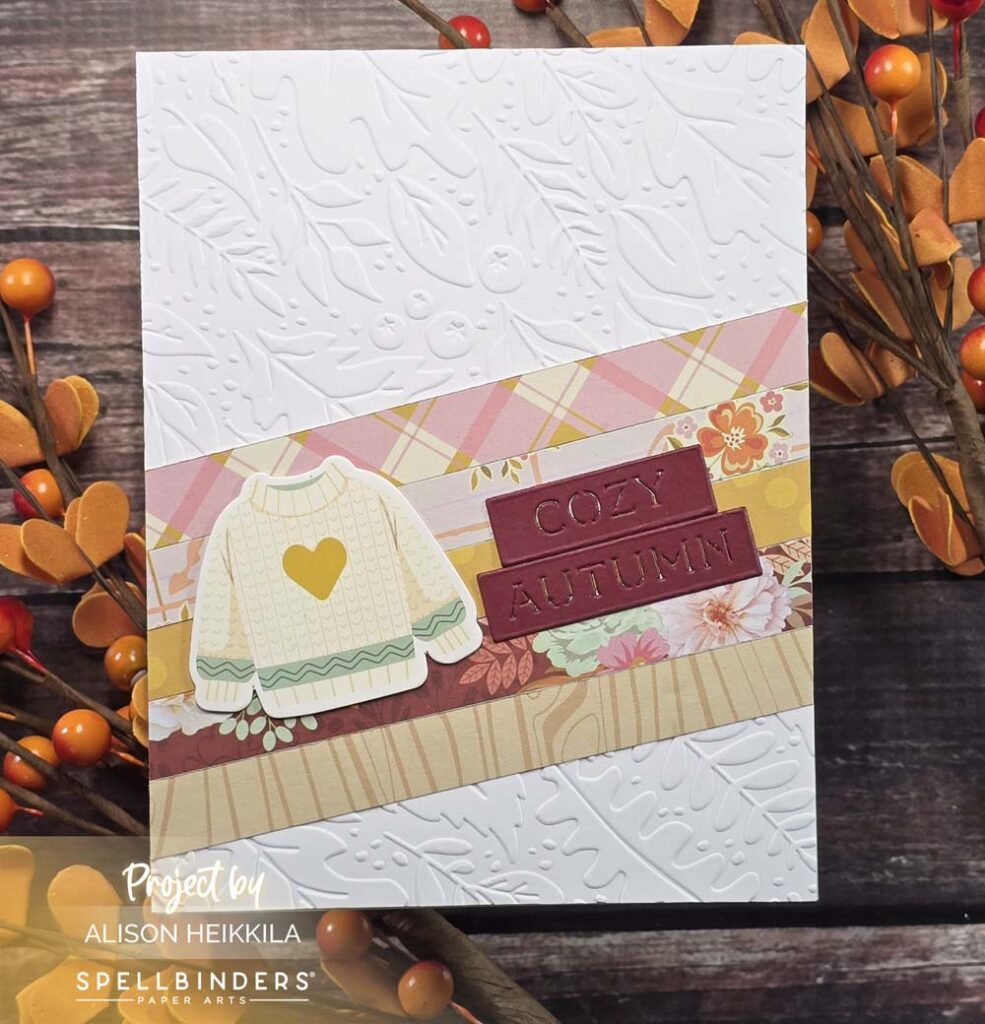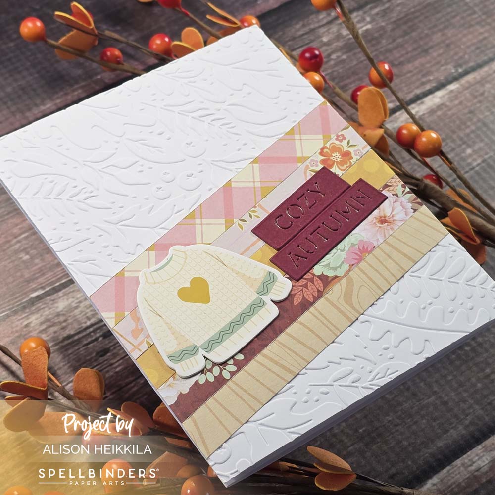 Hello! A lot of folks really liked the tag I made for Day 9 of the Spellbinders 13 Days of Craftoween because of the strips of paper I used. I decided to lean into that again for today’s card, but this time, I used printed patterned paper instead of paper I decorated myself. I also wanted to use the Embossing Folder of the Month again, because it’s so pretty. You can see another card I made with it HERE. And, you can see my Day 9 of Craftoween HERE.