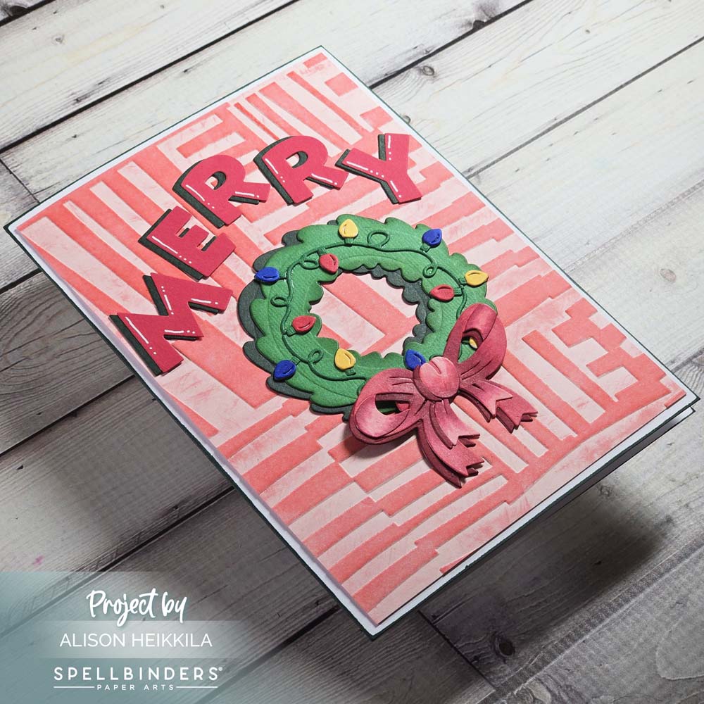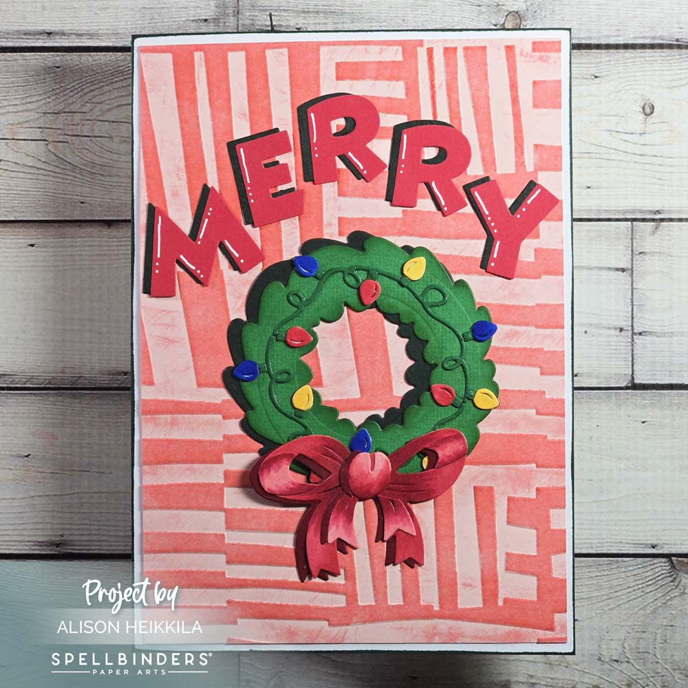 I cut the wreath from two shades of green and added a string of lights. There are several ways to decorate the wreath, but I always love the look of lights. I also added the bow, which I also die cut more than once to add the look of dimension. I hand colored the top layer with Copics. I also die cut my “merry” from red and green cardstock and added some white highlights with a gel pen.