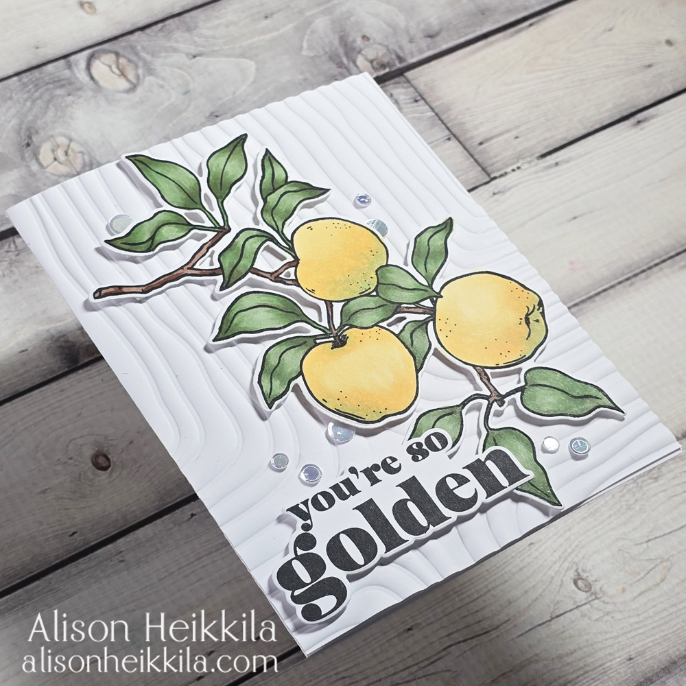 I wanted a cool background, but I didn’t want it to take away from the apples. I decided to use the Lined Corners Embossing Folder from Spellbinders. I embossed white cardstock and left it as-is. I stamped my sentiment, which is from the Hero Arts You’re Golden Stamp & Cut set, with Nocturne VersaFine Clair Ink. I popped the sentiment and the Apple Branch up with foam tape, and added some shine with Luminous White Card Bling from A Colorful Life Designs.