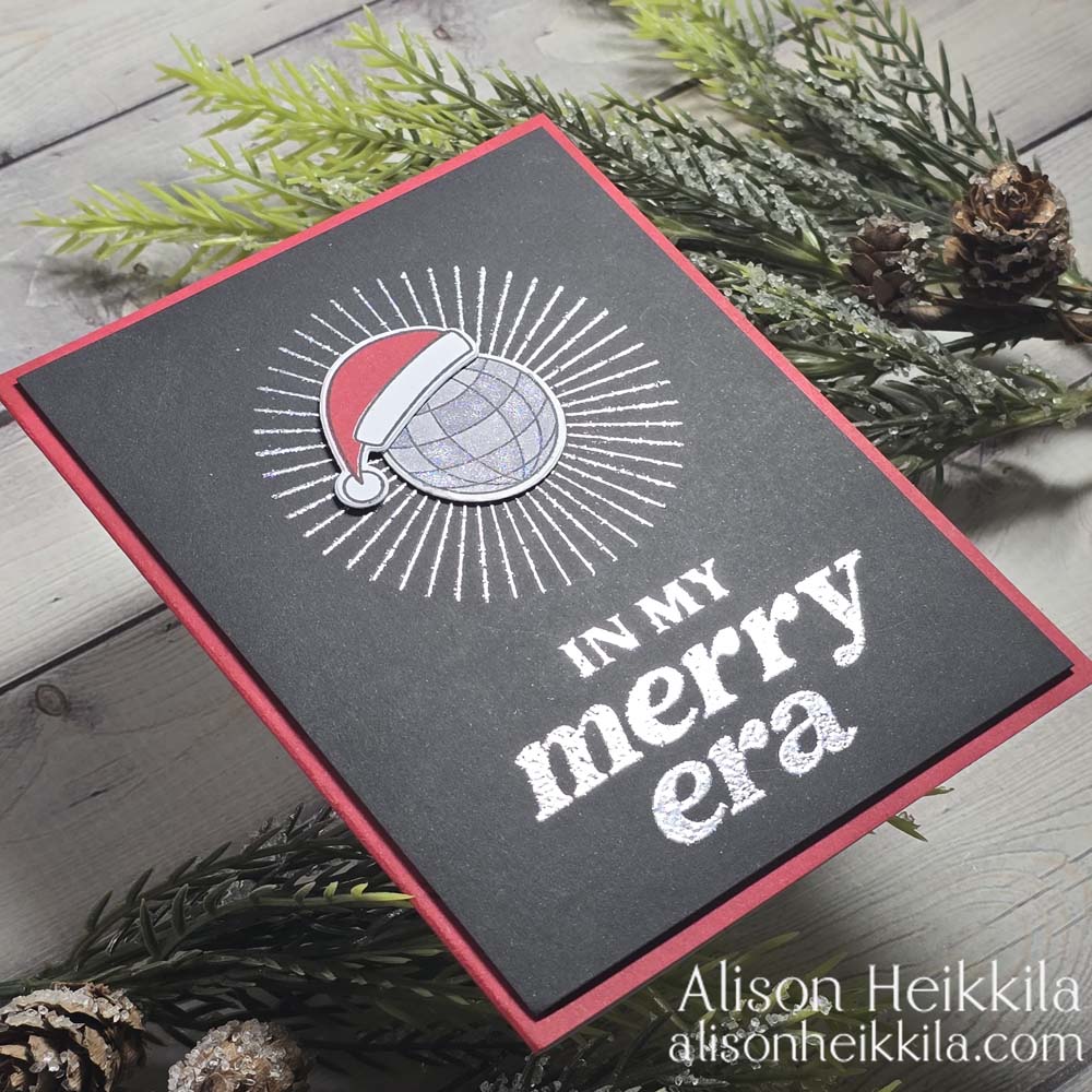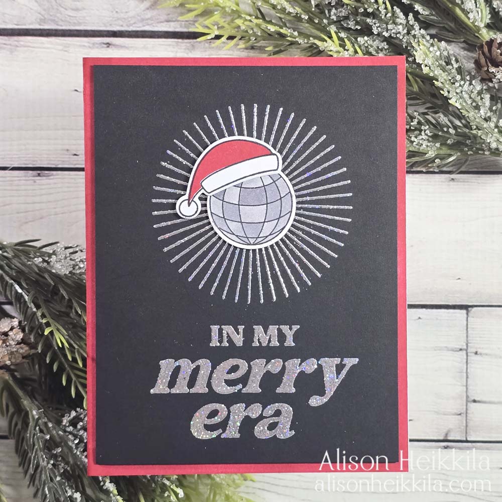 On a piece of black cardstock, I stamped the burst and sentiment with VersaMark Ink. I heat embossed them with a silver embossing powder that also has holographic glitter in it. It’s so hard to capture it in photos, but it is SO pretty in person. I adhered the Santa hat and disco ball on top of the burst (I used some 1mm foam tape under the hat). I inked the card base with the same red ink I used for the hat and then I popped the panel up onto my base with black 1mm foam tape.