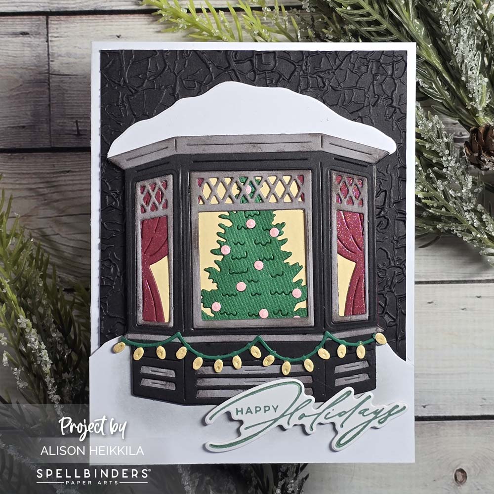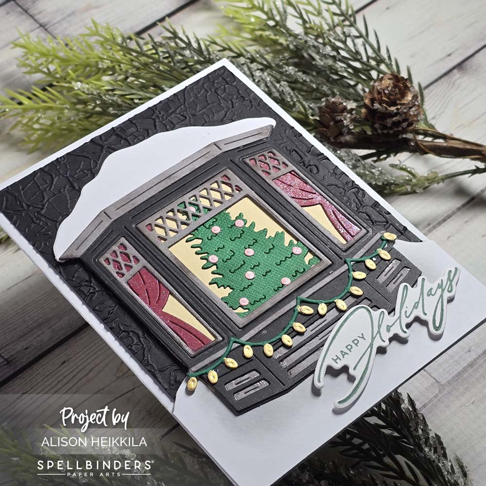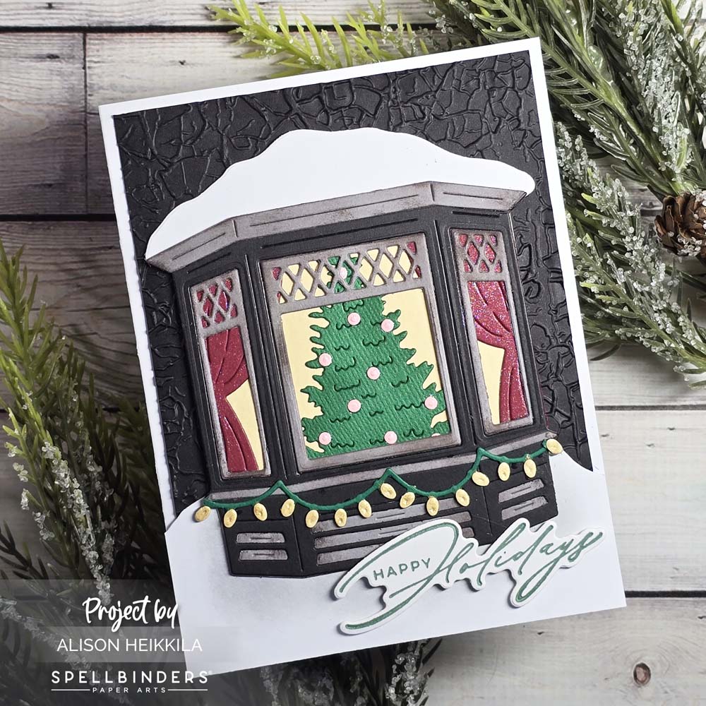 Hello! The October 2025 Large Die of the Month from Spellbinders is called Winter Wonderland, and it allows you to create a pretty window scene from the outside, plus you can have a child pulling a sled. I opted to just create the window scene, and I got to break out a BetterPress sentiment set from last year.