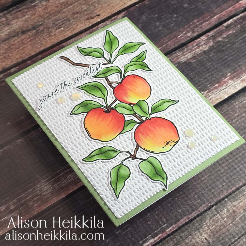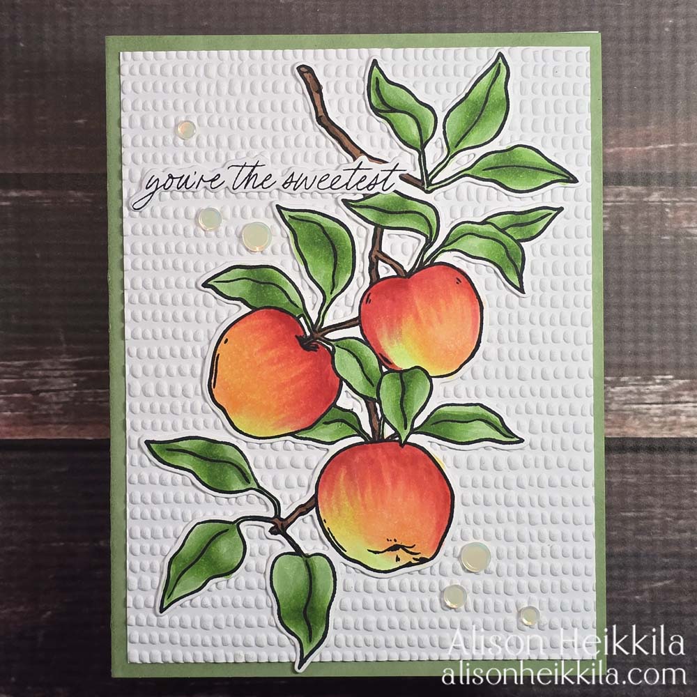 Hello! I have another apple card to share that uses the I Pick You Collection from Hero Arts. You can check out two other card I made using this collection HERE and HERE. I used the Apple Branch again but this time, I colored my apples to resemble Gala apples.