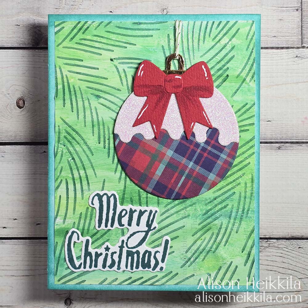 Next, I die cut some pieces from Spellbinders Festive Ornament Die Set. I used a pretty plaid, red and gold cardstock, plus a white glitter cardstock. I “hung” the ornament with baker’s twine. I also did a bit of detail coloring on the bow to give it the look of more dimension. My sentiment is from Spellbinders’ Starry Merry Christmas BetterPress & Die Set. I used Spruce VersaFine Clair Ink for that as well.
