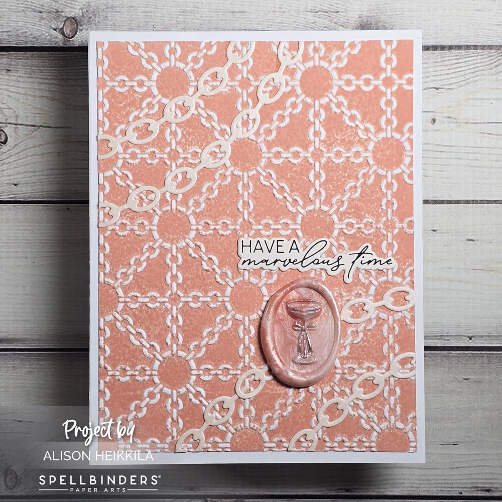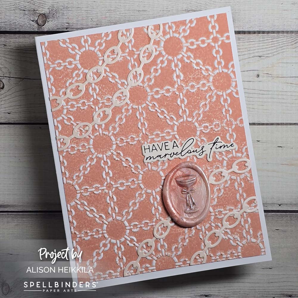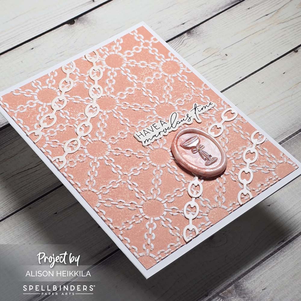 I wanted to use this month’s Embossing Folder of the Month for my background. To coordinate with the wax seal, I chose Clay Mask Ink from Catherine Pooler and rubbed the ink onto the front side of the embossing folder. I ran my white cardstock though my die cut machine and then repeated the process to get more solid color. I wanted something else on the card, so I die cut the curved chain from the Large Die of the Month from peach pearlescent cardstock several times and added them to two corners of my embossed panel. I added a sentiment from the Bestie Sentiments Press Plate and Die Set (on sale at a DEEP discount at the time of posting!) and added the panel to a white card base.