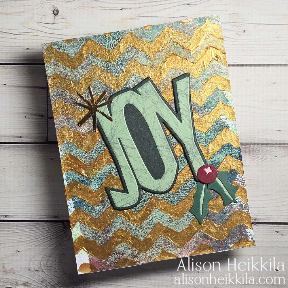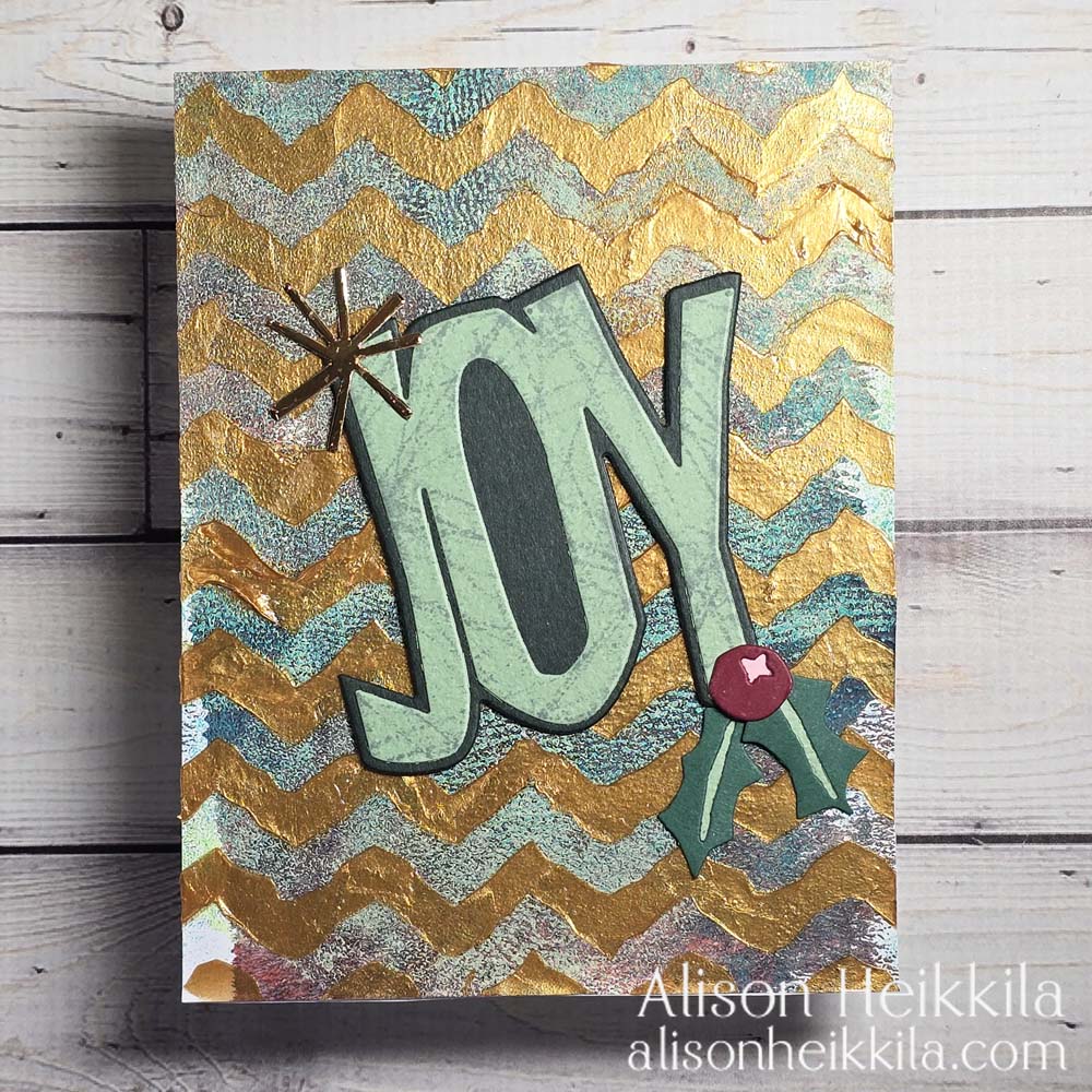 Greetings! I have a holiday card to share today that uses the Melting Chevron Stencil from A Colorful Life Designs. I also got to use a roll-off print I made during a gel printing session.