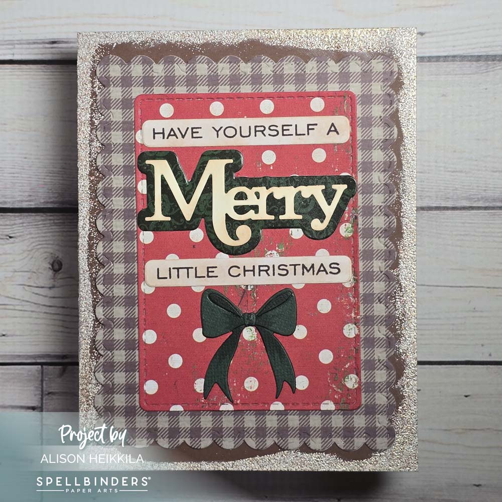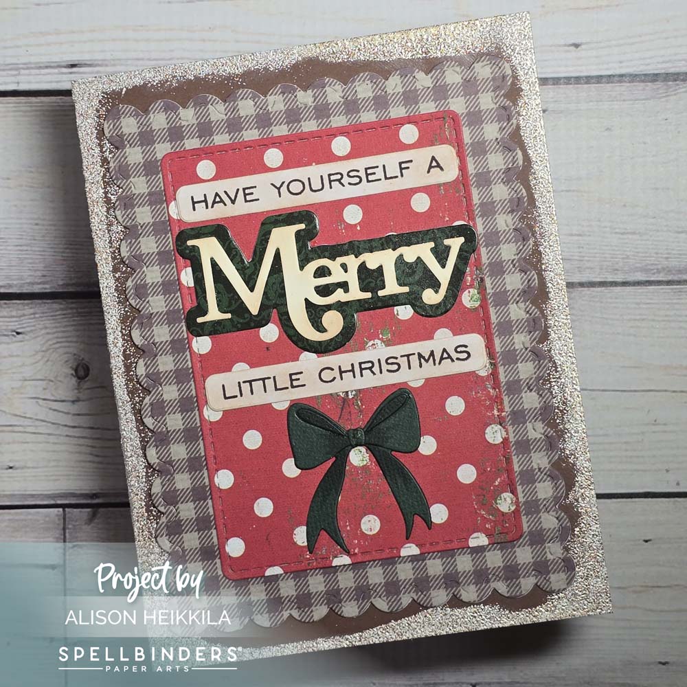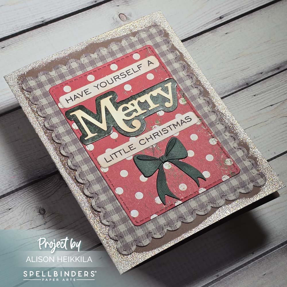 To finish off the card, I stamped and cut a sentiment from the Merry Sentiments Clear Stamps & Dies Set (and used more patterned paper on the shadow layer of the “merry.”). Then I added the bow from the frame set. I used a dark green cardstock and did a wee bit of coloring with a Copic Marker.