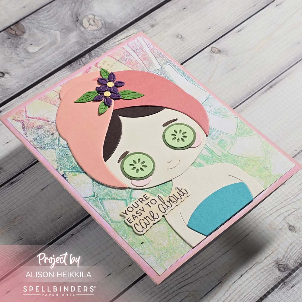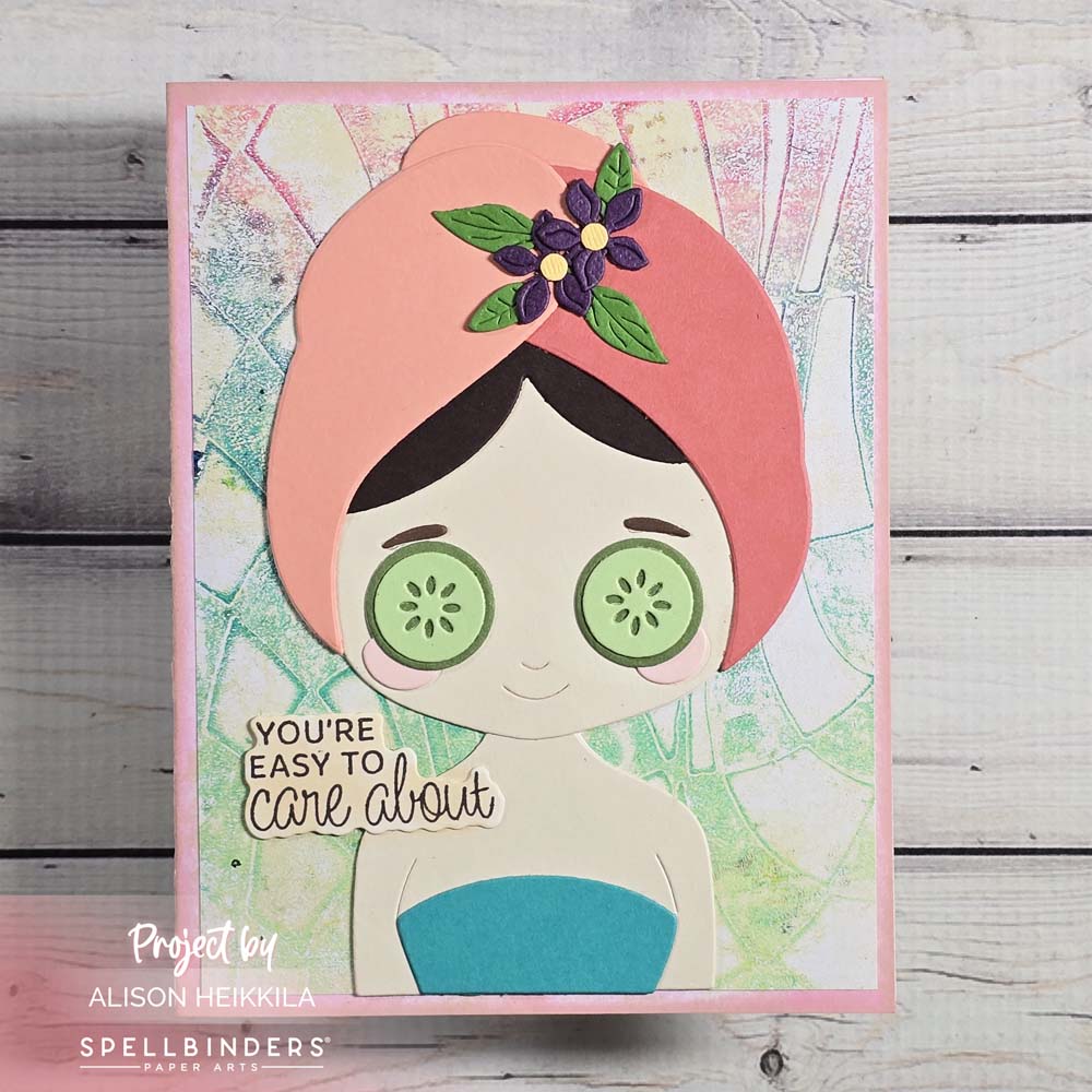 The Crumpled Checks Stencil from A Colorful Life Designs is the stencil I used to make my monoprint. It was made with acrylic paint and had been sitting in my stash for a bit, so I am so glad I got to use it. The colors on the print are what helped me to choose the colors for my die cuts. I thought the color palette was so pretty, and I got to use a bunch of Spellbinders’ Cardstock for the gal.
