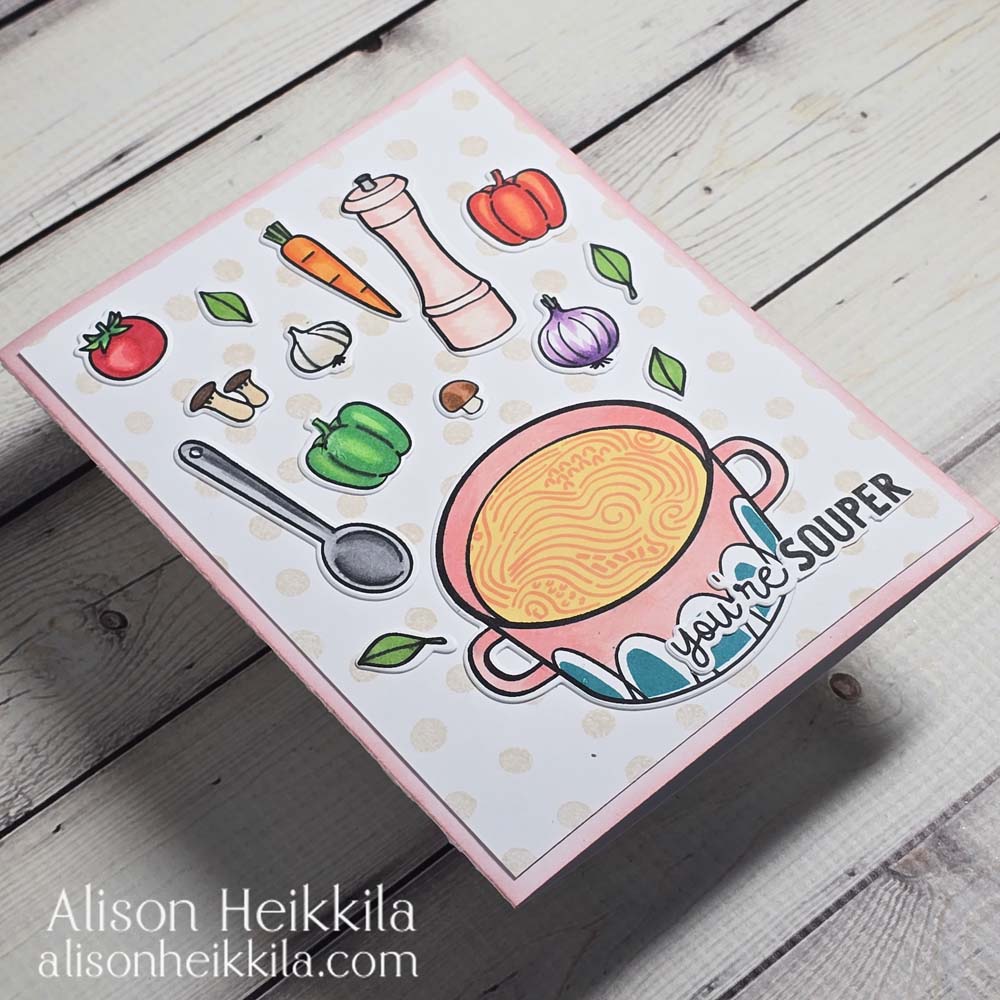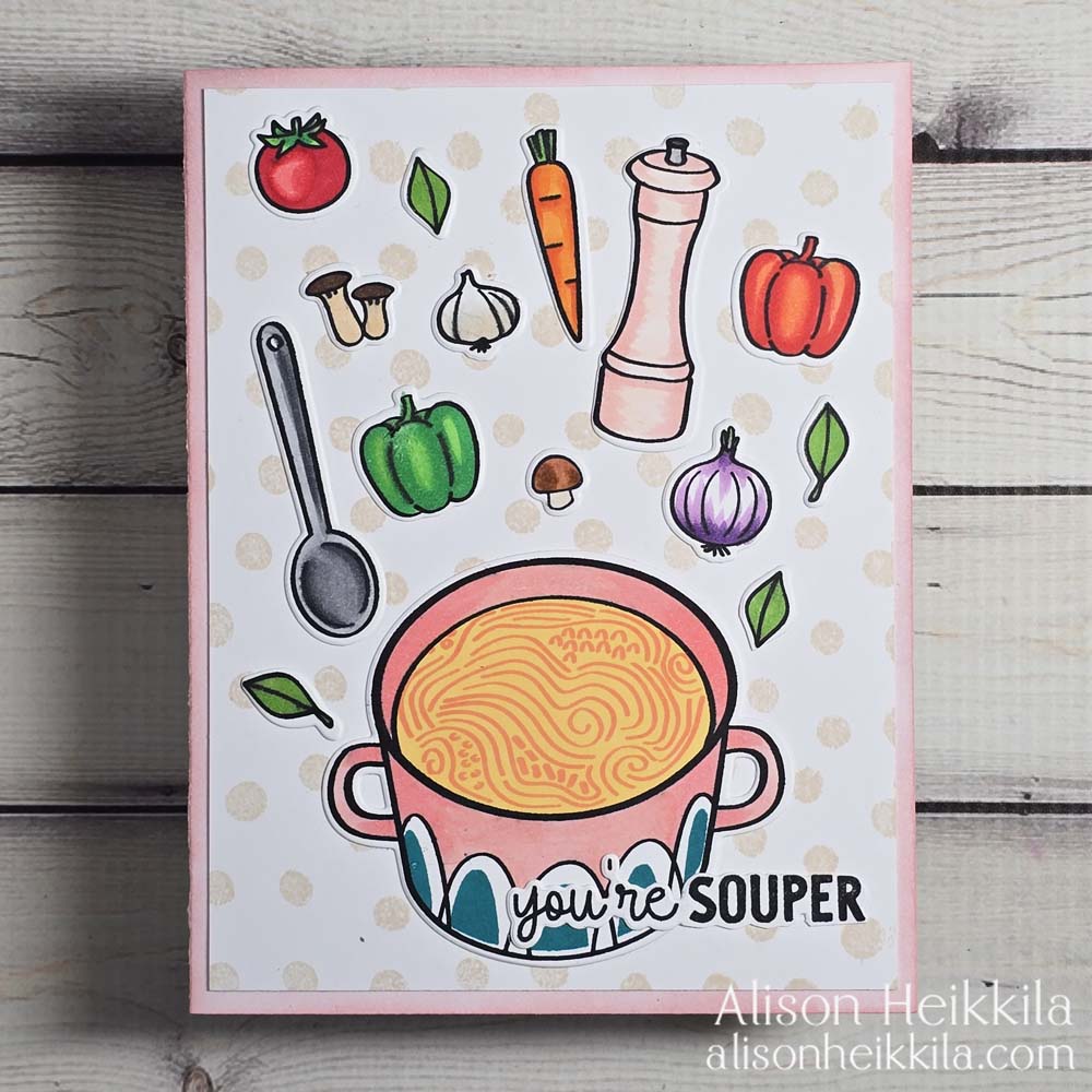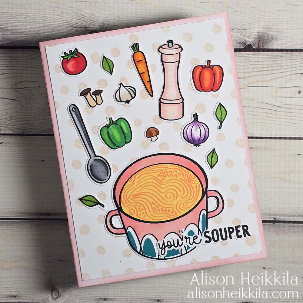 Hello! Mother Nature has just “gifted” us about 5 inches of snow, and that makes me want soup….and to live in a warmer climate. It’s also the perfect time to share another card that uses this month’s Card Kit and Cling Stamp of the Month from Hero Arts. The collection is called Soup There it Is and it’s such a cozy and punny collection.