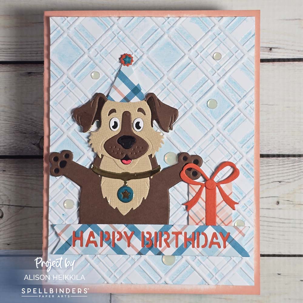 I die cut the dog using a couple shades of brown and then added his tag. The hat, present, and sentiment are from the Birthday Bear Die Set, which is part of the Sending Hugs Collection. I used some plaid paper from MFT for those elements.