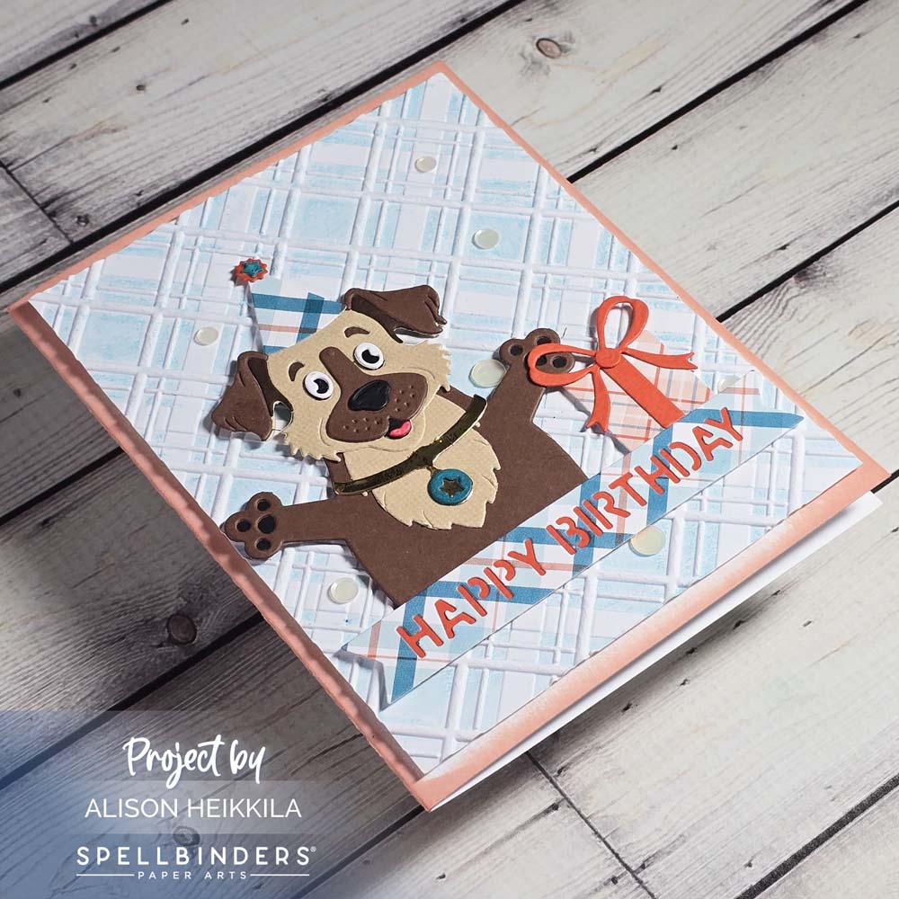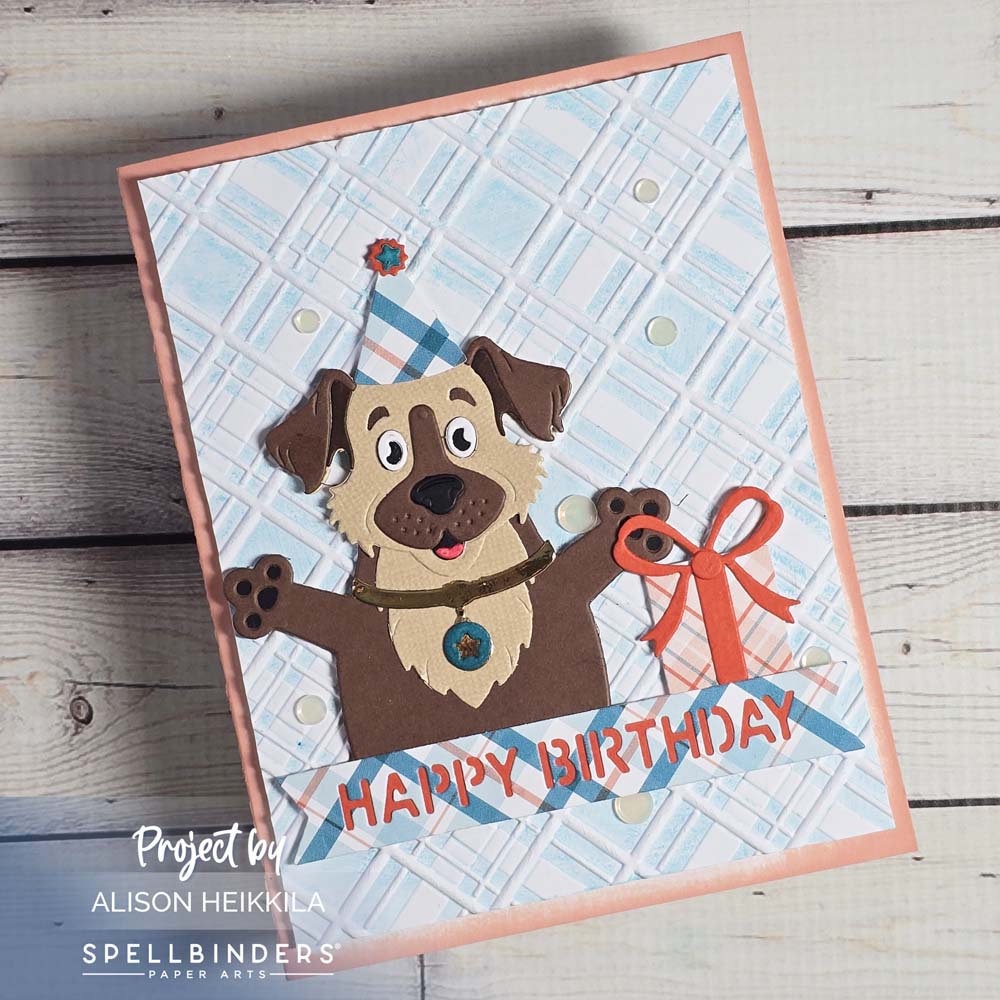 Hello! There’s a new Simon Hurley Collection though Spellbinders called Sending Hugs, and it’s made of 3 die sets that have adorable animals that want to give you a great big squeeze! I’m sharing a card I made for my son’s birthday using the Darling Dog Die Set.