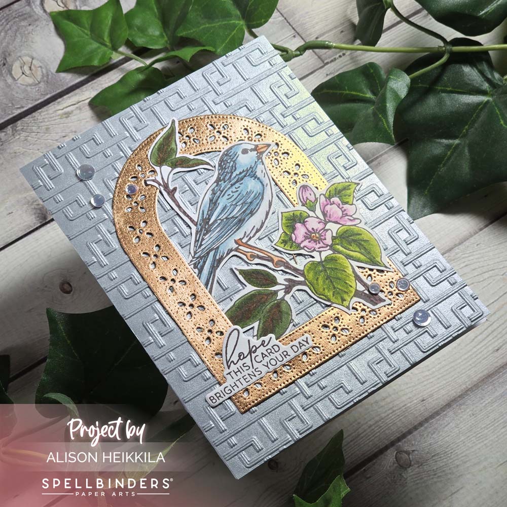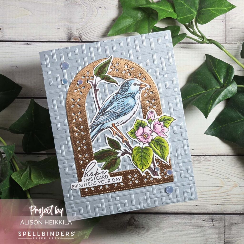 I die cut the medium arch from the new Arch Punch & Pierce Die Set from the new Regal Reflections Collection from Spellbinders from copper foiled cardstock. I love the warm glow it has. I adhered my bird to the arch tucking some parts under and having other parts on top of the arch for more visual interest. Then, I embossed a piece of light blue pearl cardstock with the new Regal Lattice 3D Embossing Folder. I used only one half of the folder, the other half has a completely different design on it. It’s such an intricate and beautiful folder. I added a sentiment from this month’s Clear Stamp & Die of the Month and some Luminous White Card Bling from A Colorful Life Designs for additional shine.