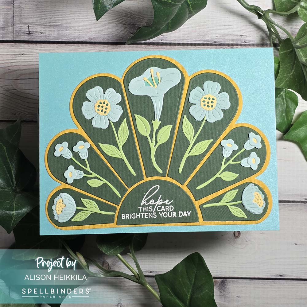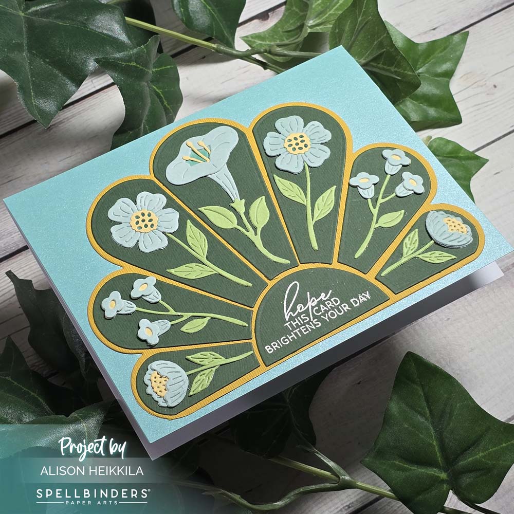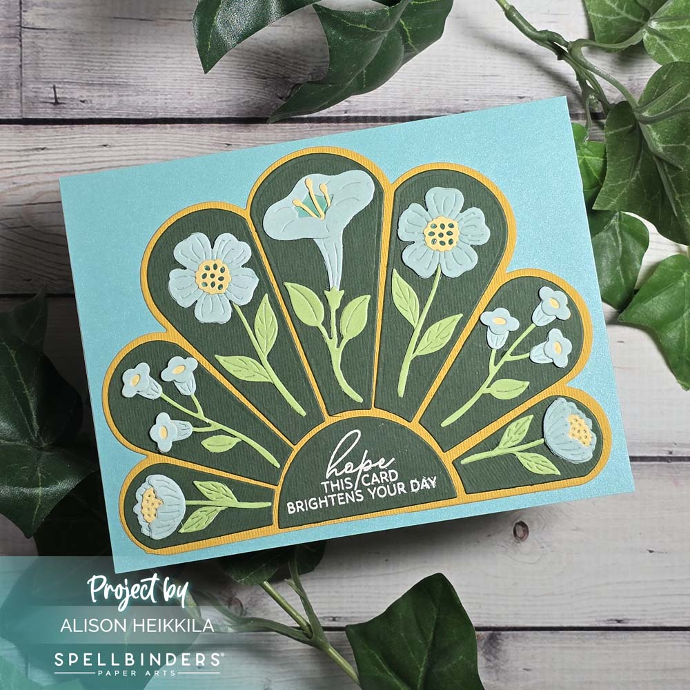 Hello! Today’s card uses the January 2026 Small Die of the Month from Spellbinders….but this die set isn’t small at all! You can easily turn it into a shaped card, and as you’ll see below, the main parts of the die set take up almost an entire A2-sized card front. It’s called Sunny Stems, and it’s very unique.