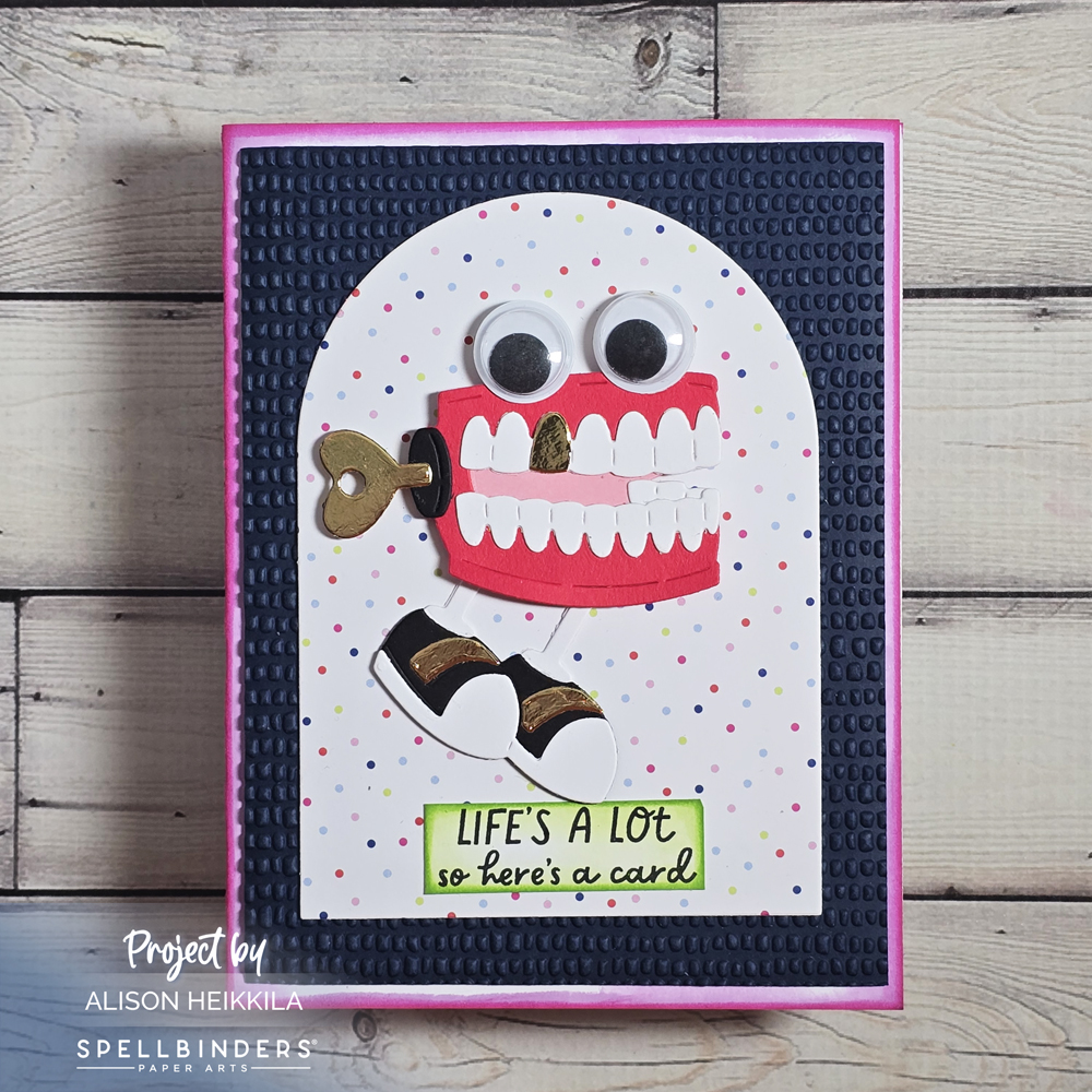 I started by die cutting the Dancin’ Chatterbox. My good friend Deana suggested I give him a gold tooth, which I thought was an amazing idea! I added that, plus a few other god accents with some metallic foiled paper from Recollections. I also thought googly eyes would be fun, so I added those too. Turns out, you can get some that are the perfect size HERE at Spellbinders! I love that his little legs can swing. He seriously cracks me up. Here’s a look at how he moves.