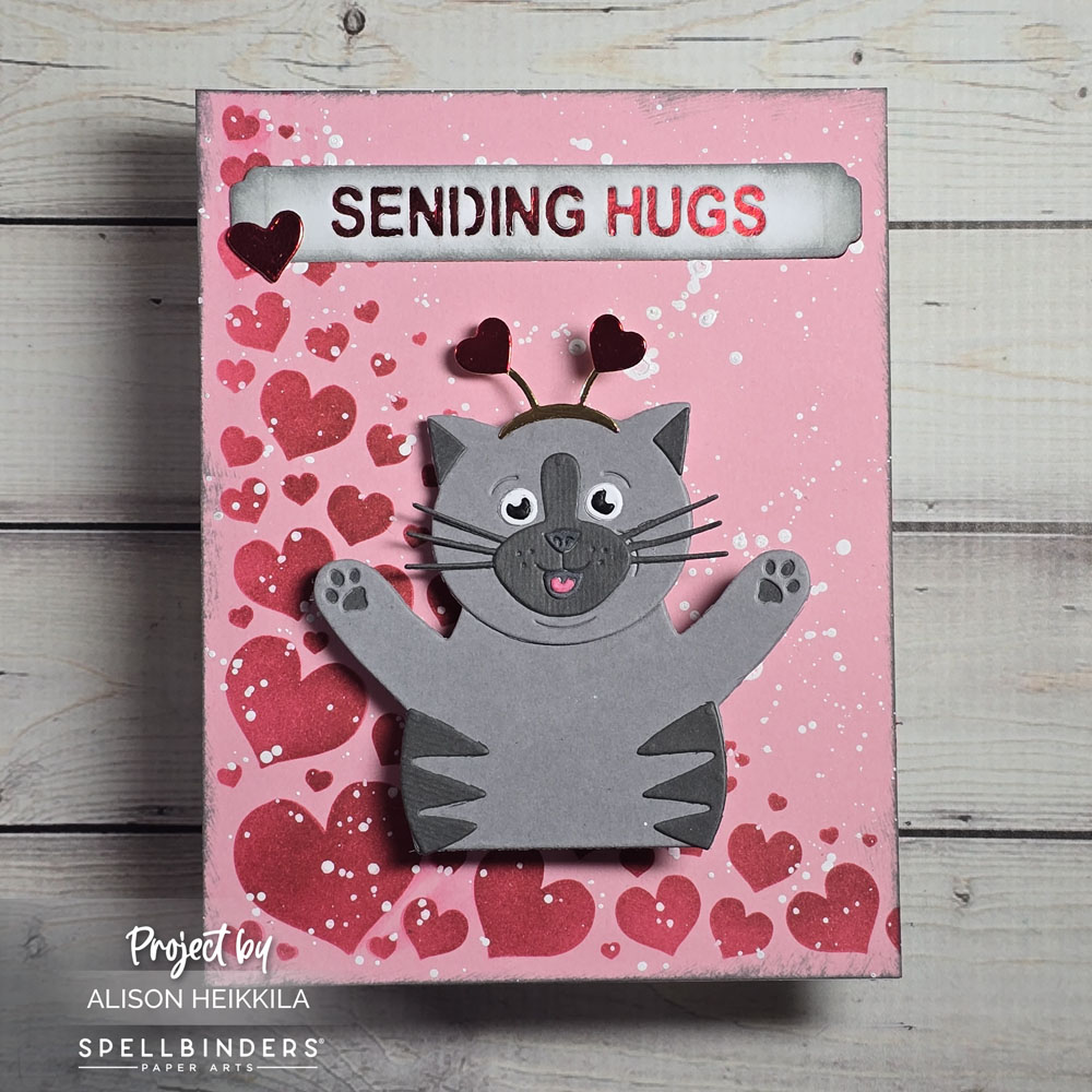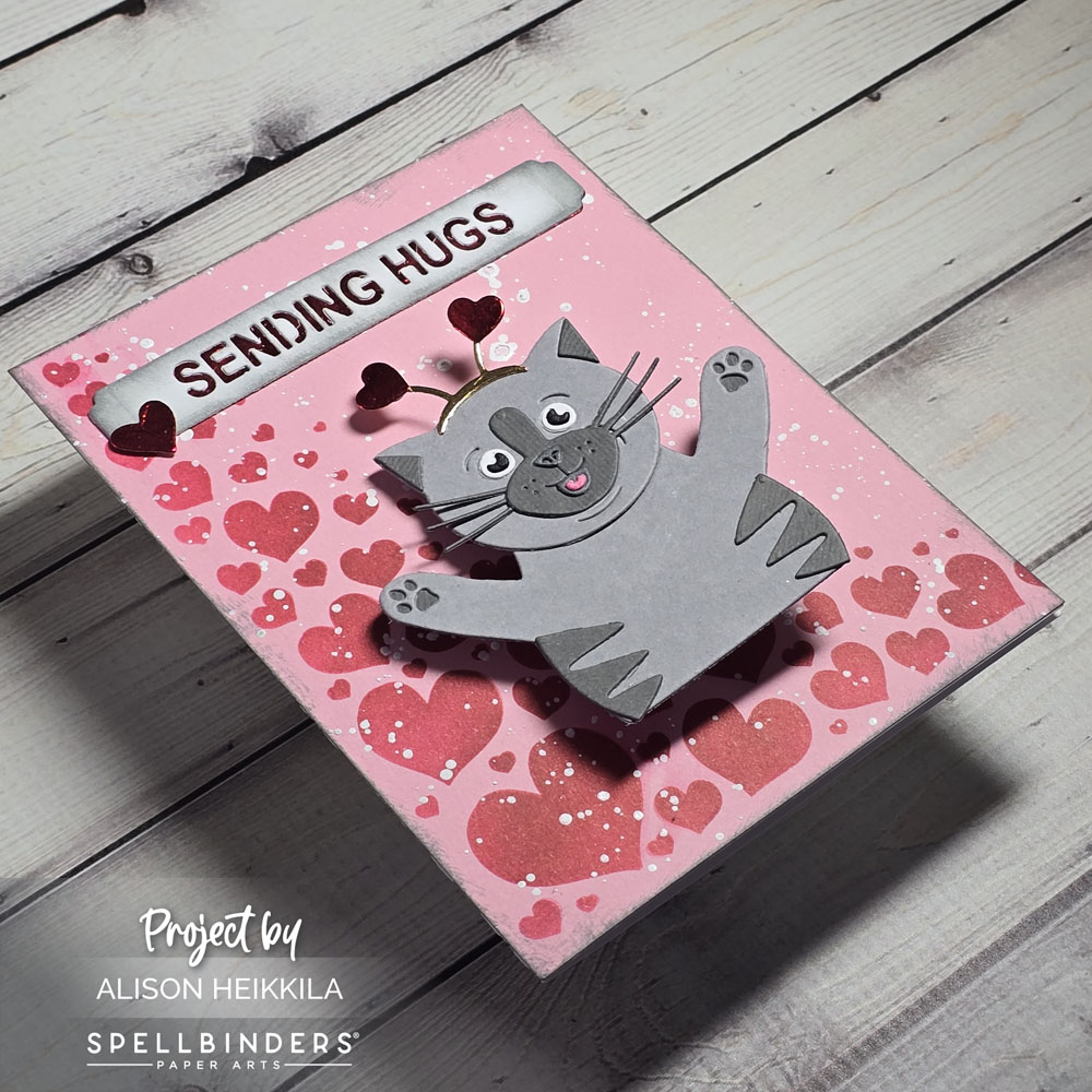 Hello! I made this card for my son, who is away at college, for Valentine’s Day. I miss him a ton and I thought it would make him smile. The Sending Hugs Collection from Simon Hurley and Spellbinders was perfect. I used the Darling Dog Die Set for his birthday, and today I used the Congrats Cat with some of the die from Darling Dog.