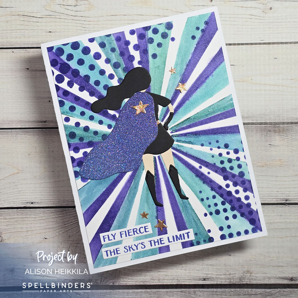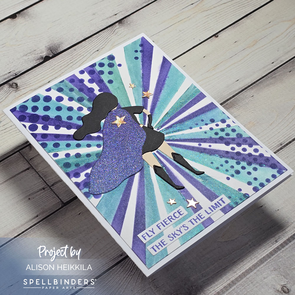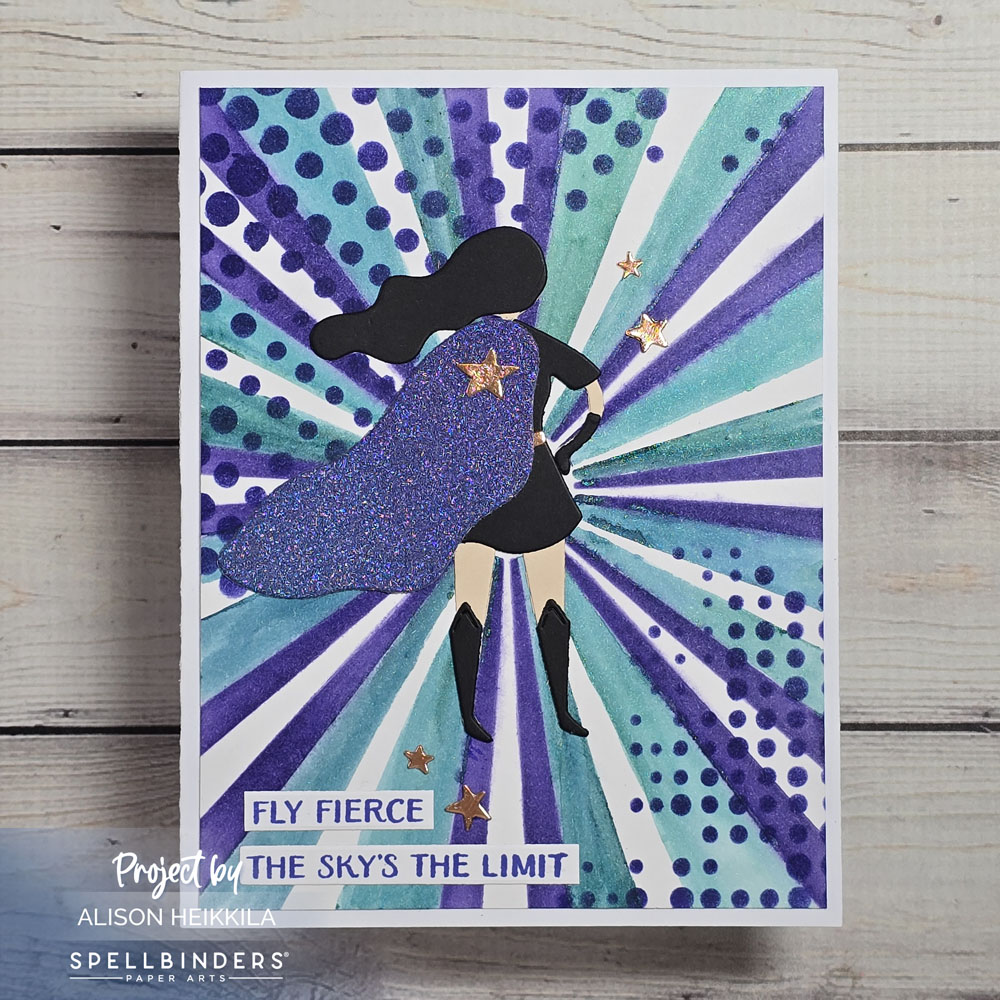 Greetings! I wanted to share my take using the Spellbinders Stencil of the Month and their Small Die of the Month. I wanted to use some of my favorite colors and some fun papers to make a dark, almost goth version of a super hero.