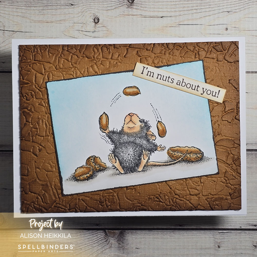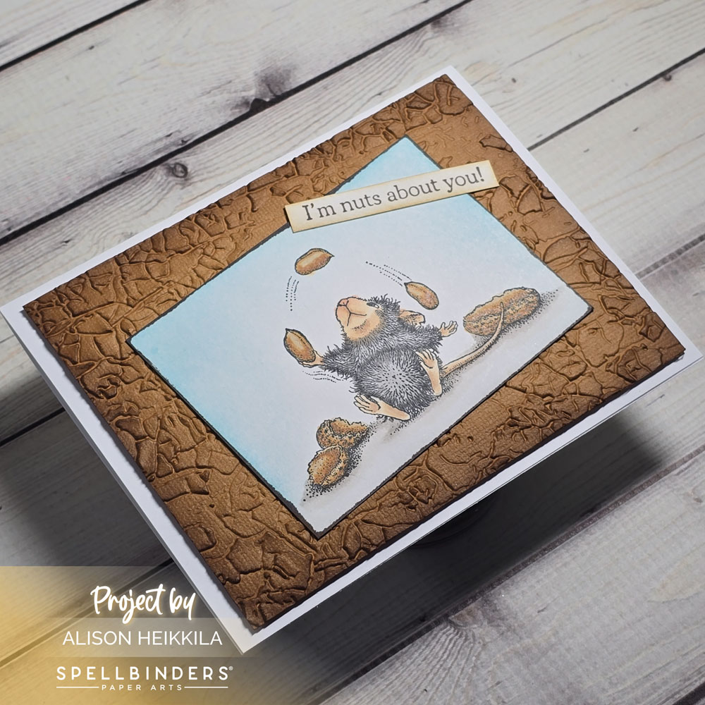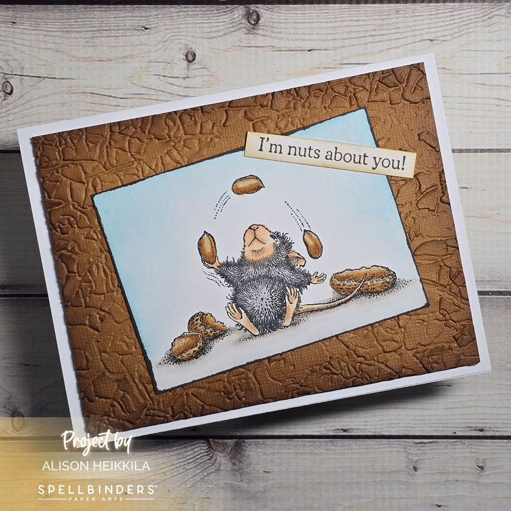 Hello! Today I’m sharing a card using the brand new collection from House Mouse Stamps available from Spellbinders, called Party Parade. This card features the Nuts About You Stamp Set, and I got to use one of my favorite 3D Embossing Folders with it.