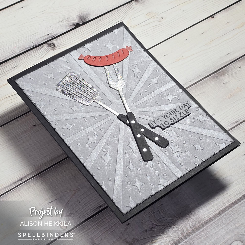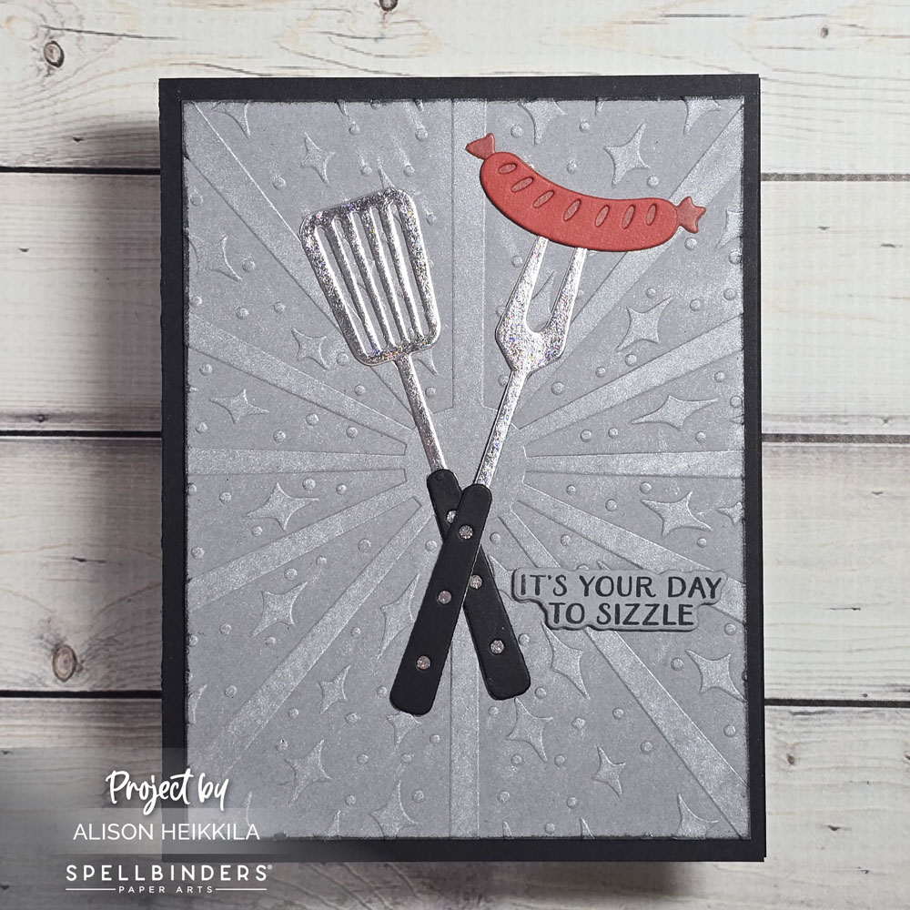I started by cutting the grilling tools and the sausage which are in the Large Die Set of the Month. I used a metallic foiled paper from Michaels for the tools, which looks really great. I chose one of the sentiments from the Clear Stamp & Die Set and stamped it onto gray cardstock with Nocturne VersaFine Clair Ink.