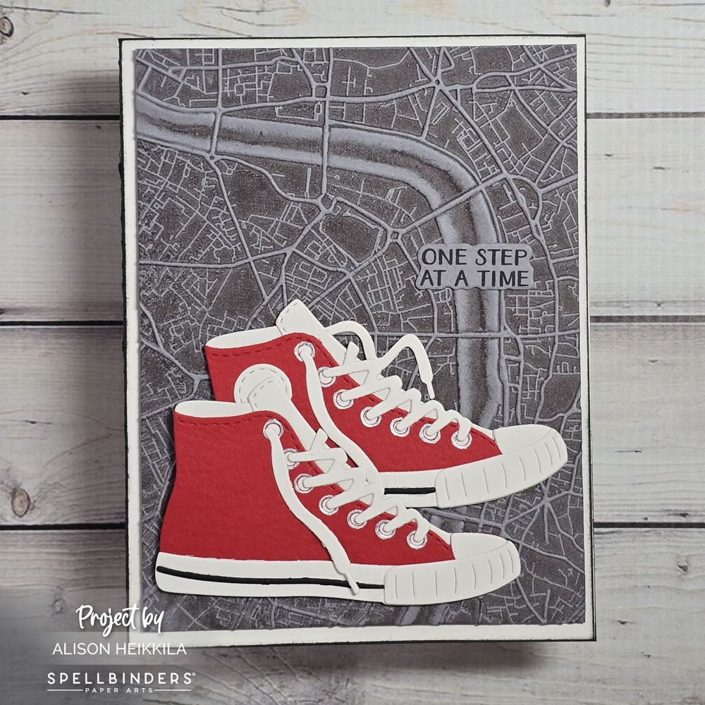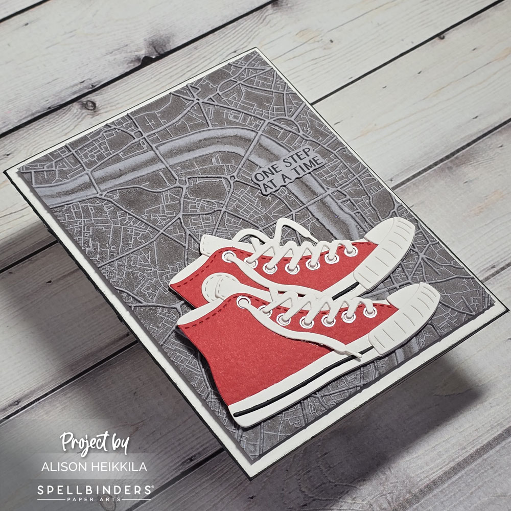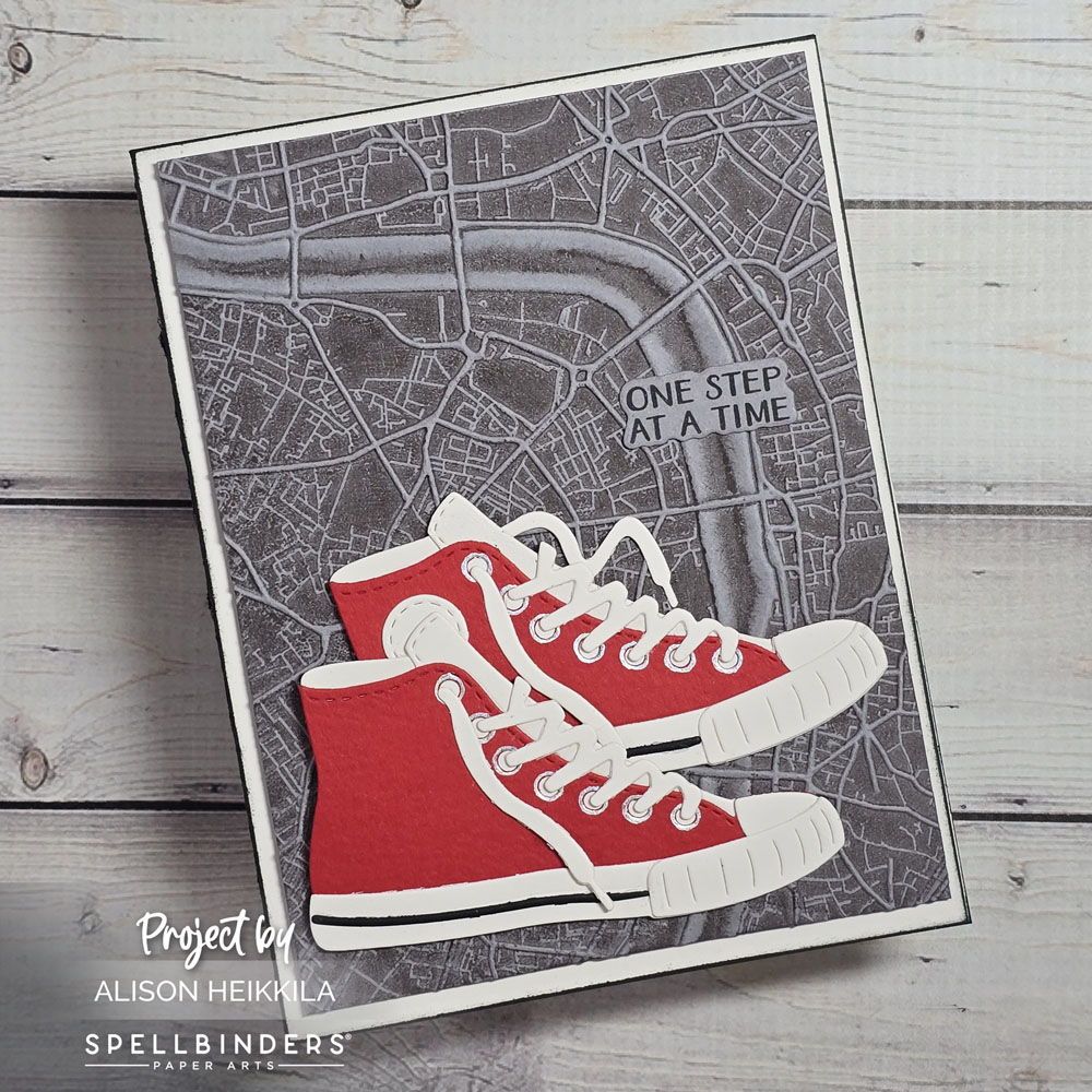 My background was made with the March 2026 3D Embossing Folder of the Month. It’s called Urban Grid and it’s such a cool map! I inked the folder with Charcoal Suit Ink from Altenew before running my gray cardstock through my die cut machine. I used the same cardstock for my sentiment, which is from the Clear Stamp & Die Set of the Month. I mounted everything onto an ivory card base (the same color I used for the shoes), and I added a verrrrry thin border of Nocturne Ink to the edges.