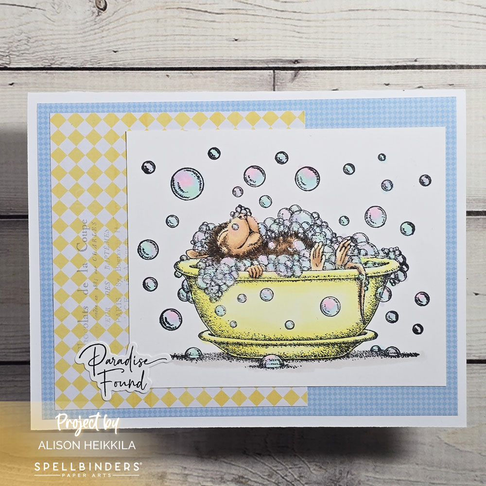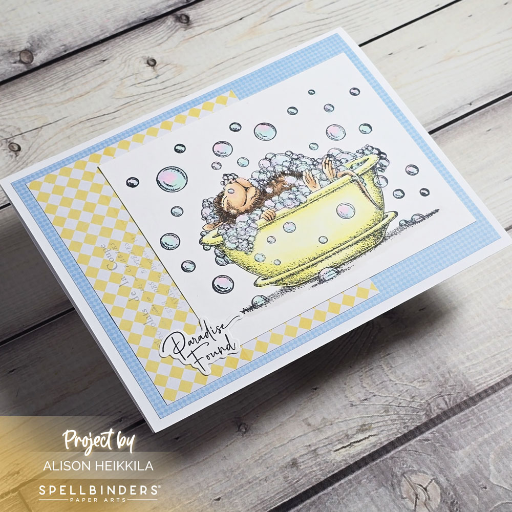 Hello! Today I’m sharing a card using the brand new collection from House Mouse Stamps available from Spellbinders, called Party Parade. I used the Spa Day Stamp Set for my card today, and I got to use some patterned paper from the previously released 6×6 Paper Pad from Spellbinders and Rosie’s Studio, called Breakfast in Bed.