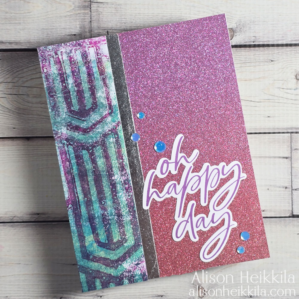 To coordinate with the monoprint, I chose a piece of ombre glitter cardstock from Recollections. I added a strip of silver foiled cardstock to separate the two focal papers. I added a sentiment from Honey Bee Stamps Big Time Kindness Stamps and Coordinating Dies, which I inked with Purple Delight VersaFine Clair Ink. Then I added some Crystal Opaque Jade Isle Card Bling.