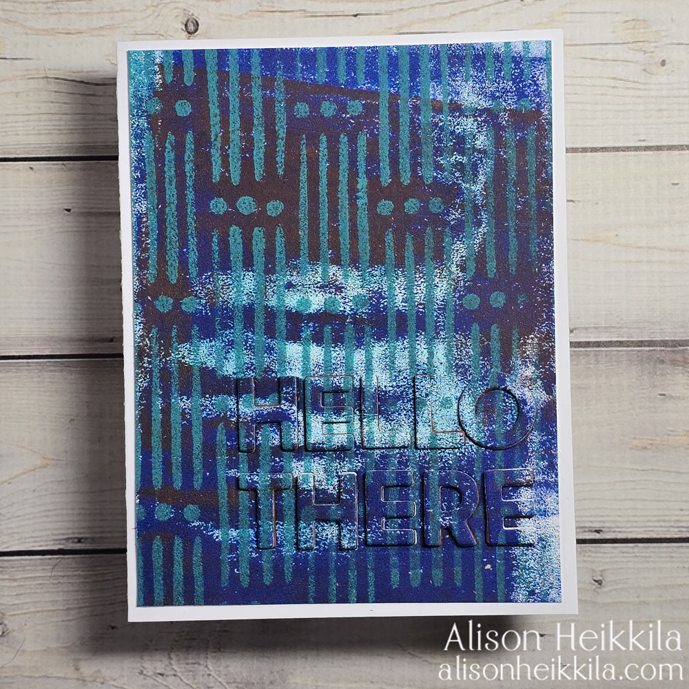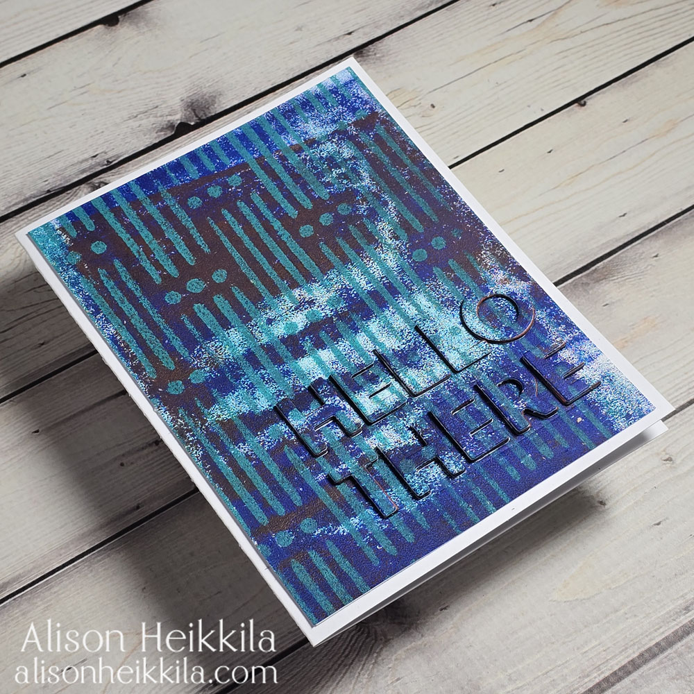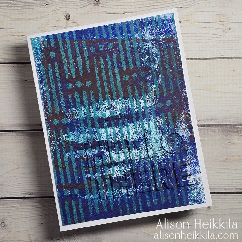 Hello there! I haven’t made an eclipse card in a while, so I decided to make one using the Lines and Dots Stencil from A Colorful Life Designs. If you don’t know what an eclipse card is, here’s a good definition: An eclipse card is when you cut a word or image (but usually a word) out of a decorated card front and then use foam pads to “raise” that cutout above the level of the rest of the card front, for a subtle dimensional effect.