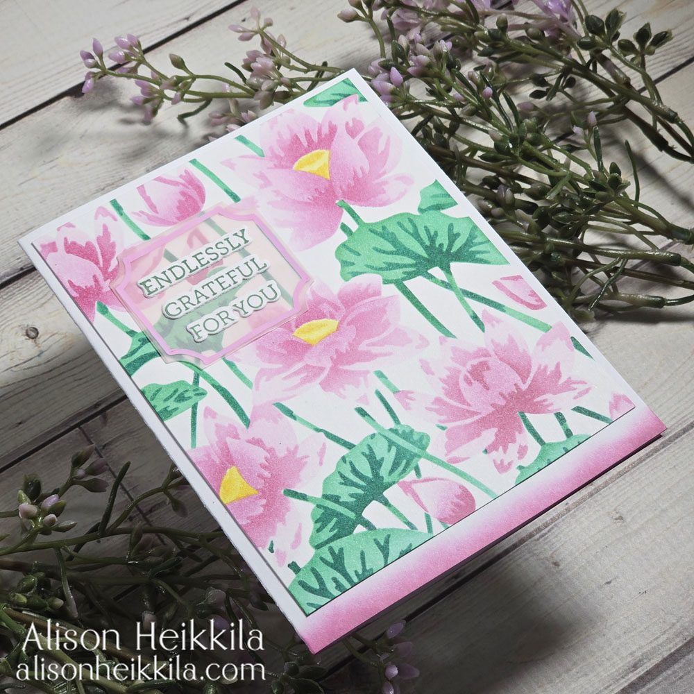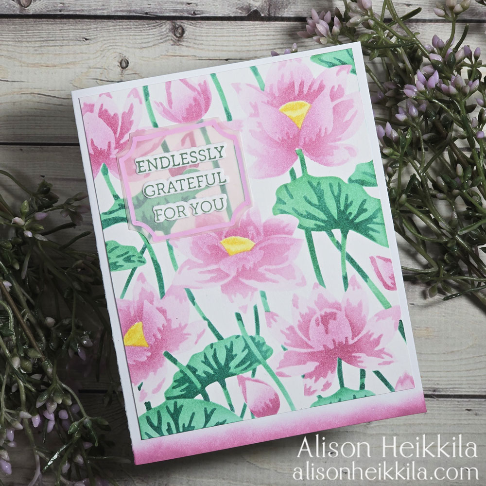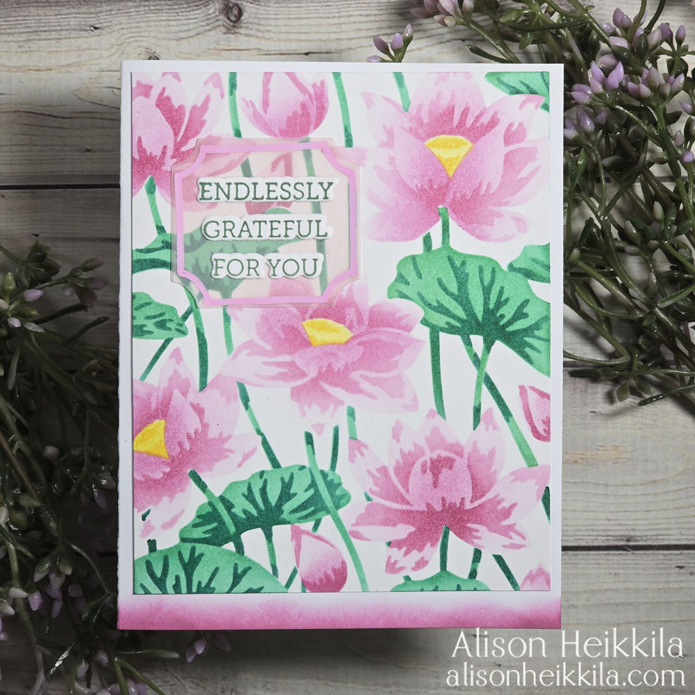 Hello! Today my card uses products from the Tranquil Garden Collection from Hero Arts. I’m using a beautiful layering stencil set called Lotus Field, with my Catherine Pooler Inks. There’s a coordinating Press + Foil Plate, but I don’t have it. But you’ll see, the stencils work beautifully on their own.