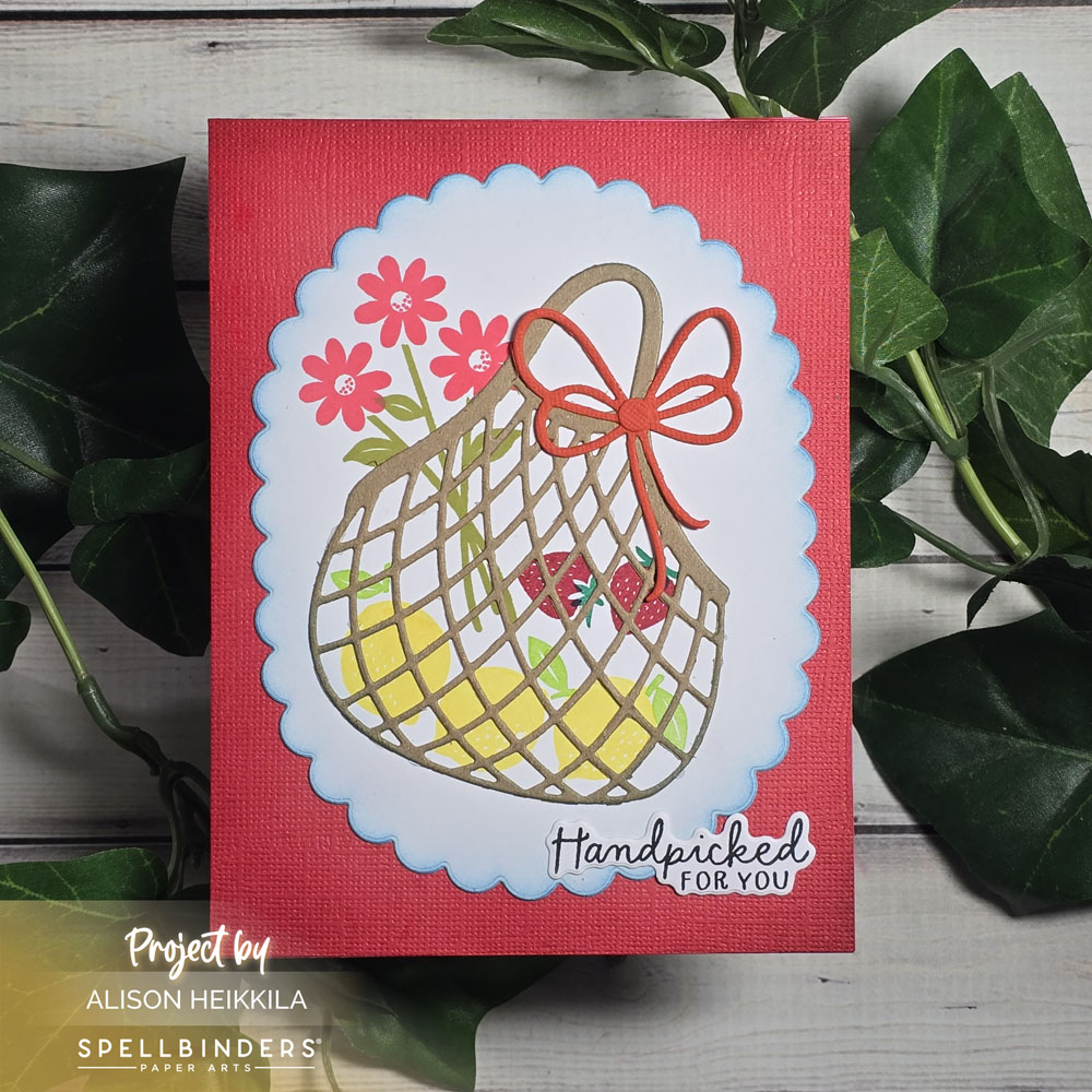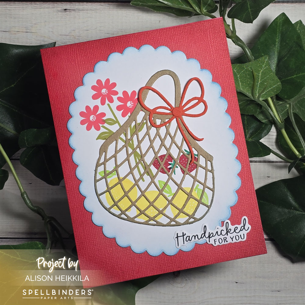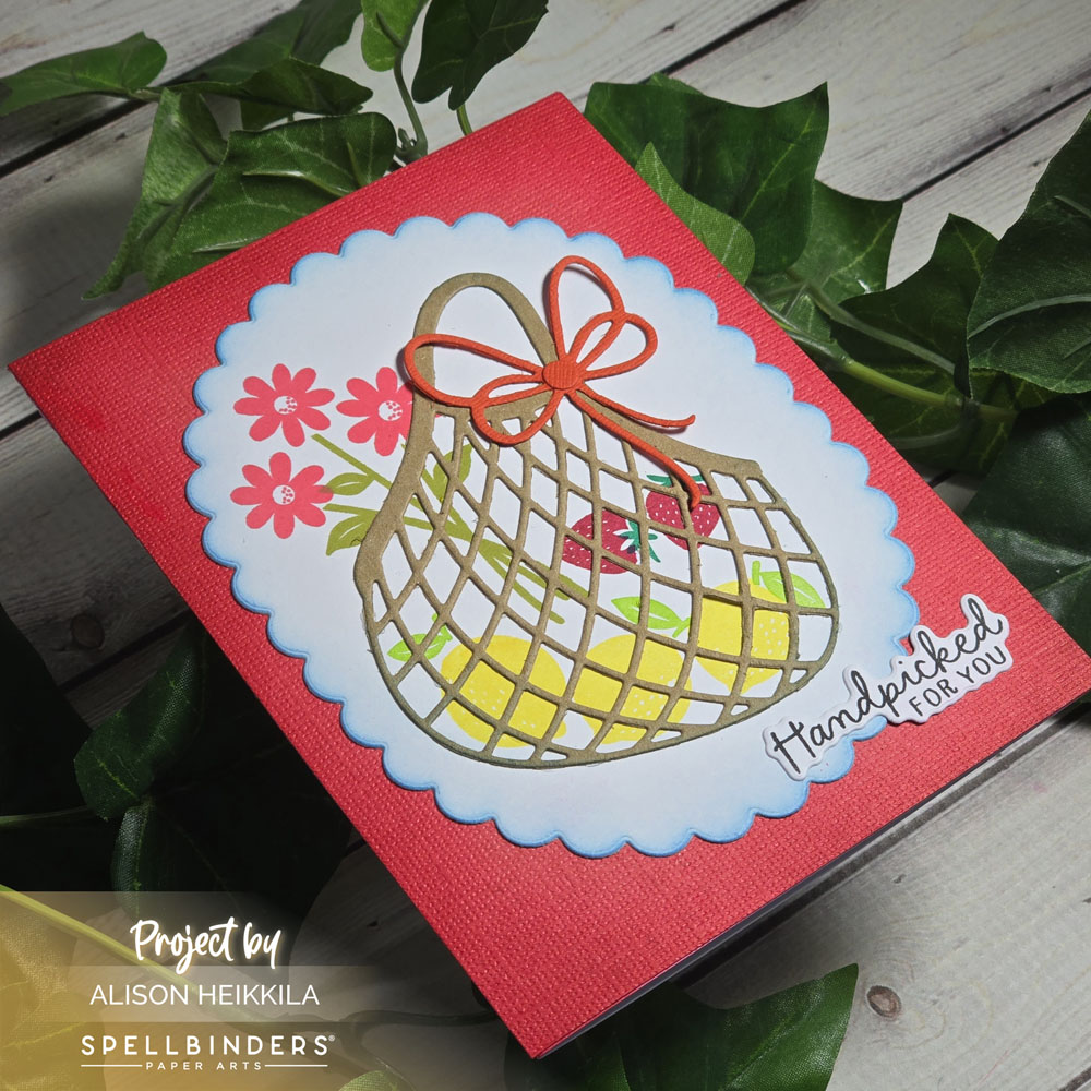 Greetings! My card today uses the Clear Stamp & Die of the Month from Spellbinders, plus an older die set that I really love. This set is called Fresh Packed and I love the sweet silhouette images and the cool mesh bag die it comes with. I used lots of warm colors for this card because I wanted a summery vibe.
