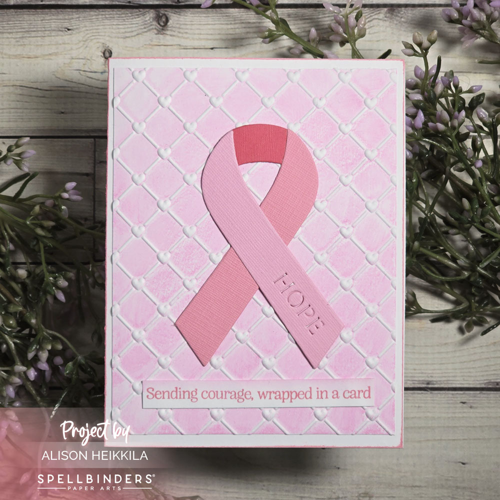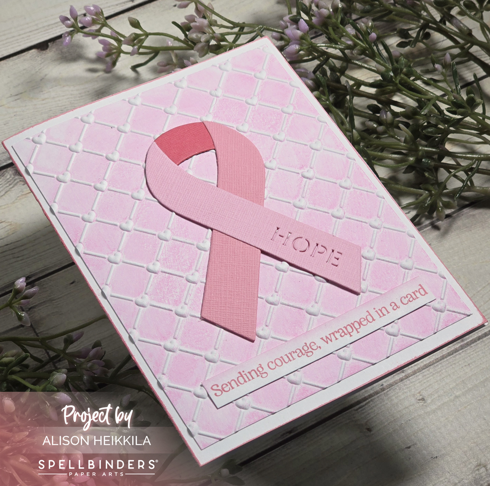 I die cut my ribbon with 3 shades of pink cardstock, and I used the “Hope” die on one of the tails. For my background, I used the Cross My Heart 3D Embossing Folder. I inked the top side of my folder with Kitsch Flamingo Distress Ink.