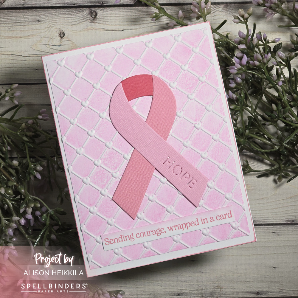 Hello! Today I have another card using the Awareness Ribbon & Sentiments set from Spellbinders, this time with lots of pink, to represent breast cancer awareness. This card comes together very quickly and can be adjusted to any color to suit the ribbon you’re working with.