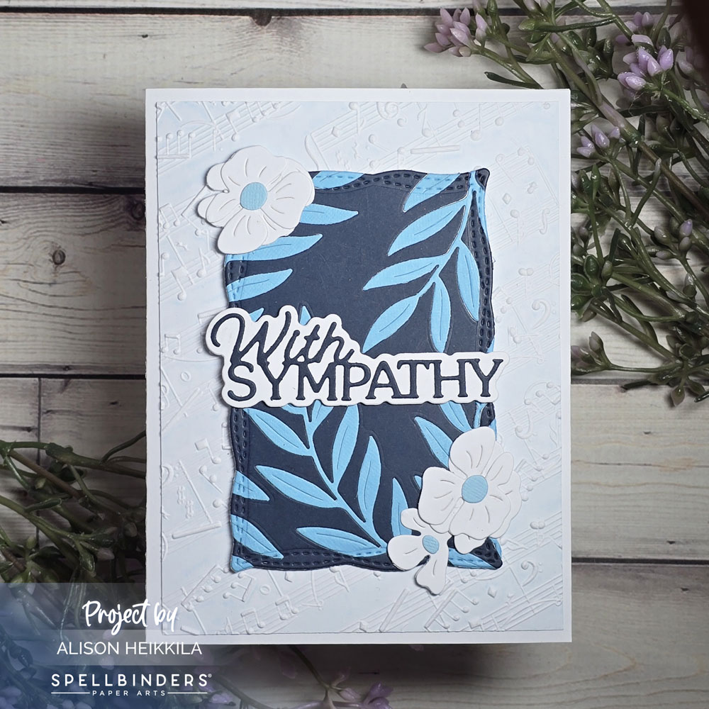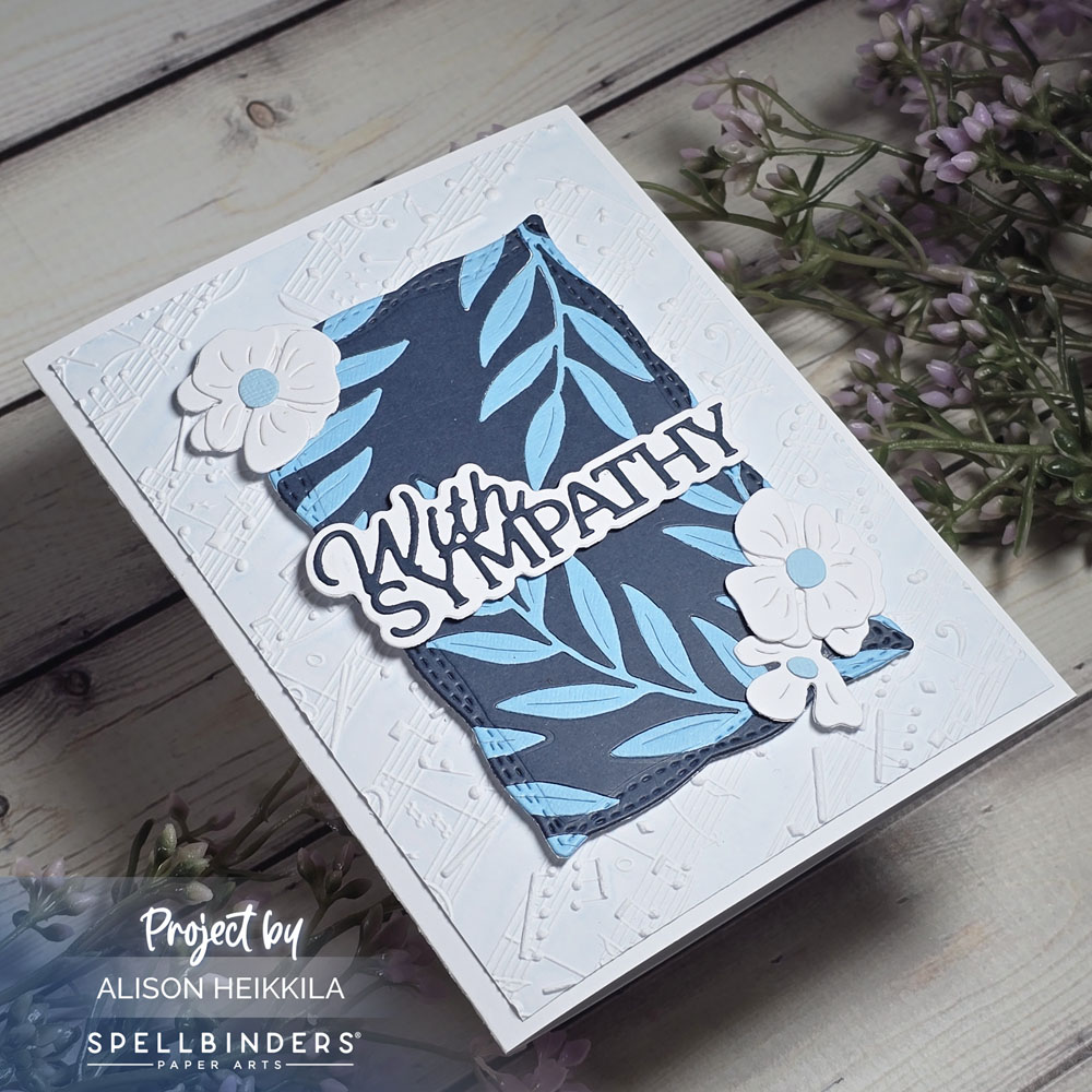 I used more of the Leaf and Bloom dies to add some flowers to my focal panel. The Layered With Sympathy Dies were cut from white and navy cardstock and adhered on top of the focal panel. I wanted some more texture, so I used the Favorite Song 3D Embossing Folder. I took white cardstock and inked the front side of the folder with Summer Sky Memento Ink and ran it through my die cut machine. It’s very subtle, but it makes the notes stand out even better. I added everything to a white card base.