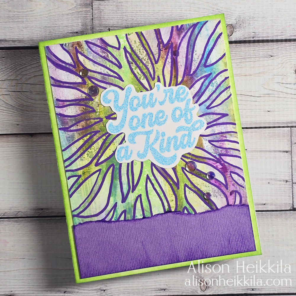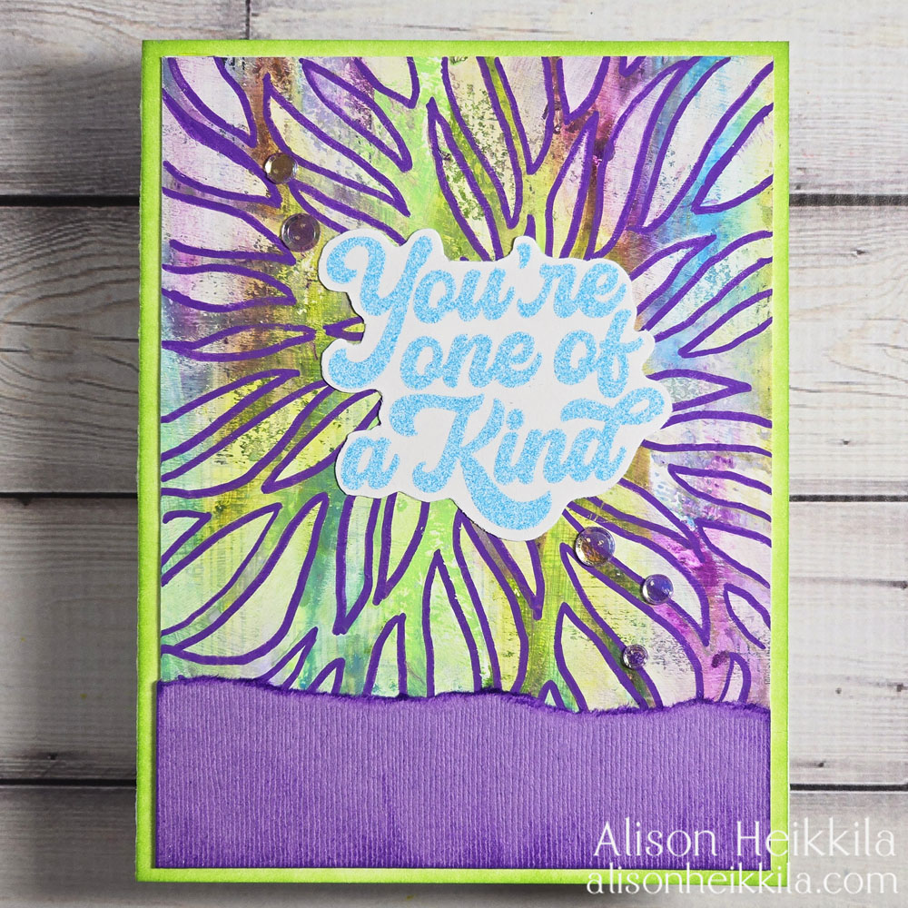 Hello! Today’s card features the new Twirly Mask and Crystal Iris Wild Orchid Card Bling from A Colorful Life Designs. I had begun a background with Gelatos some time ago, and it just sat, waiting for the right moment to be used. I thought it was going to be perfect with this mask.