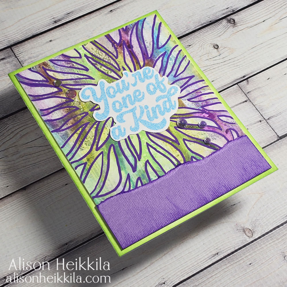 The Twirly Mask is round, so it doesn’t cover the whole front panel of my card. I liked the edge of it showing, but I decided I wanted another element of interest, so I tore a piece of textured cardstock and inked it a bit with Wilted Violet Distress Ink. I inked my card base with Lime Rickey Ink from Catherine Pooler. My sentiment is from the Totally Awesome Stamp Set from Hero Arts, and apparently I have NO TURQUOISE INK (how is this even possible?!) so I used some embossing powder for it. What’s your favorite turquoise-colored ink? I gotta get some! Then I added that pretty Crystal Iris Wild Orchid Card Bling for some shine.